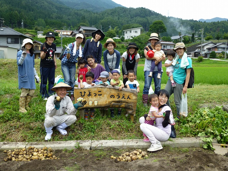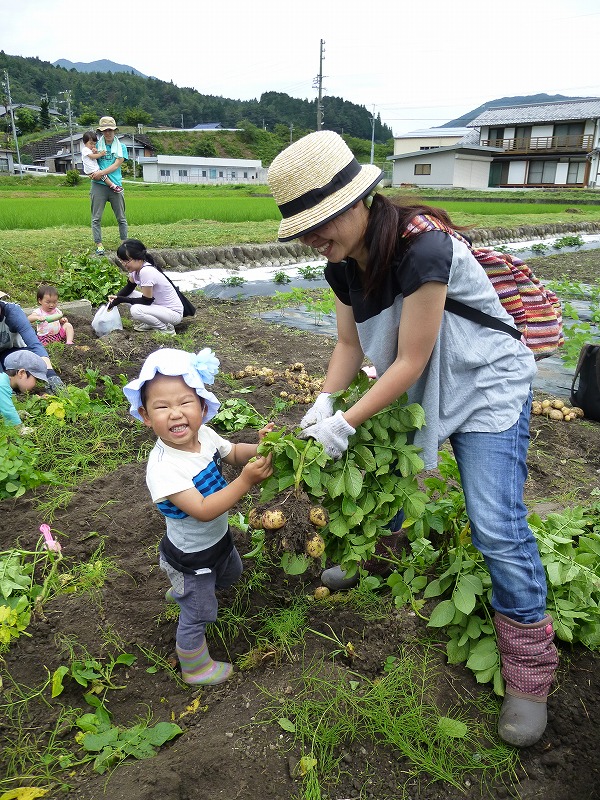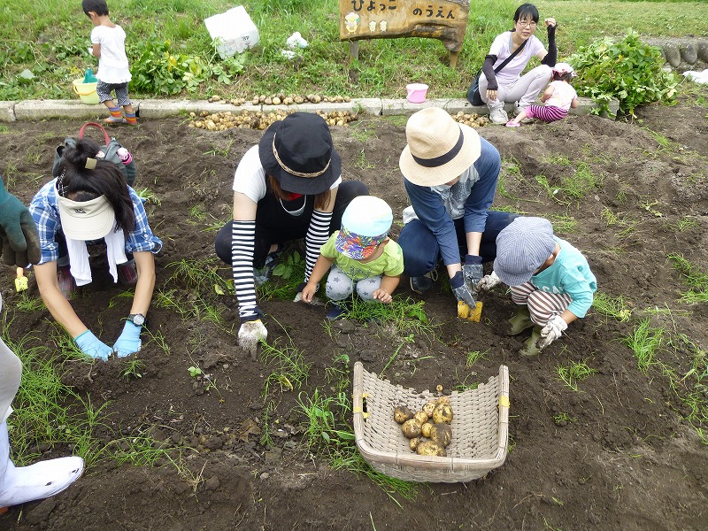 7組の親子と農園スタッフ2名が参加しました。 じゃがいもの茎をひっぱると大きなじゃがいもがくっついてきたので「うわー。」と歓声が上がりました。 さらに土の中を掘ると、じゃがいもがゴロゴロと出てきました。 「初めてじゃがいもを収穫しました。子どもに掘る体験をさせる事ができて良かったです。」と言う意見を頂きました。