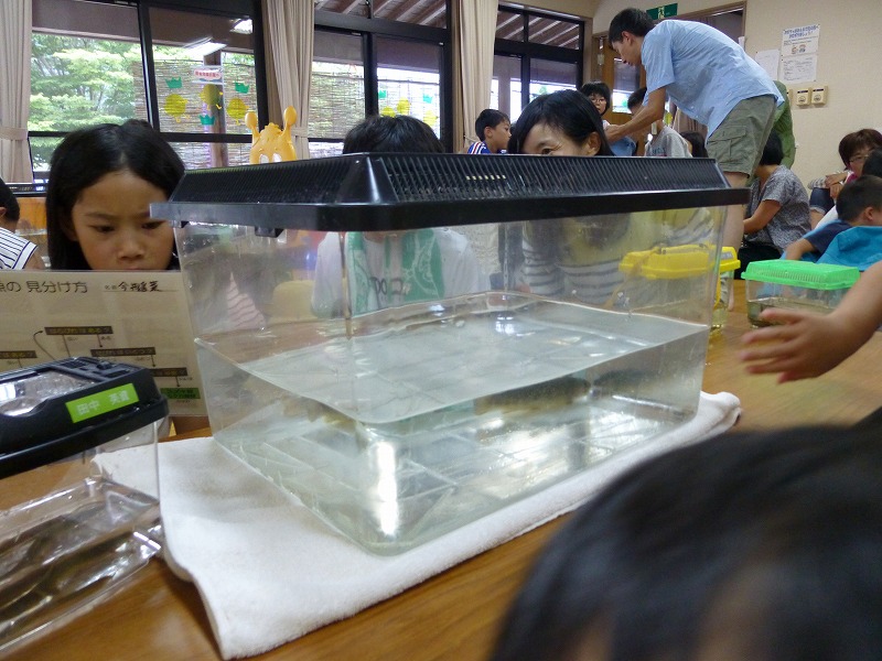 子どもたちはたくさん採った生き物を見せ合いながら「こんなにどじょうを捕まえた。」と喜んでいました。