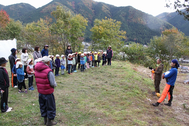 きたこども園の年長さんが、森林伐採の現場を間近で体感しました。 大迫力の倒木の瞬間を見た園児たちは、圧倒されていました。 「木が倒れる時の大きな音にびっくりした。」「木を切る人がかっこ良かった。」という声を聞きました。 この森のようちえん事業を通して、子どもたちの木に対する思いが強くなっていくといいです。