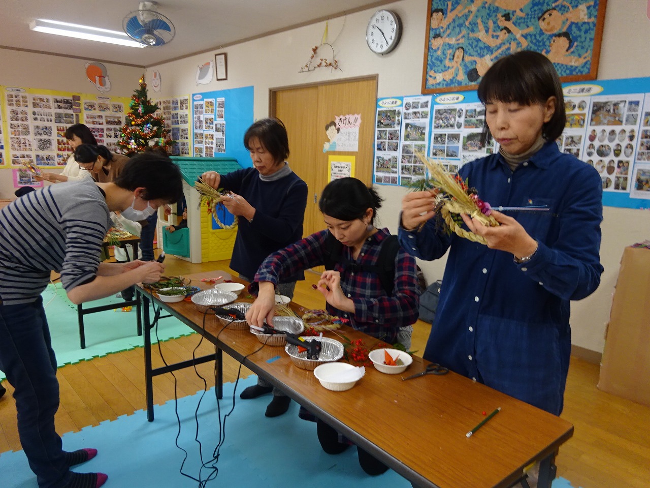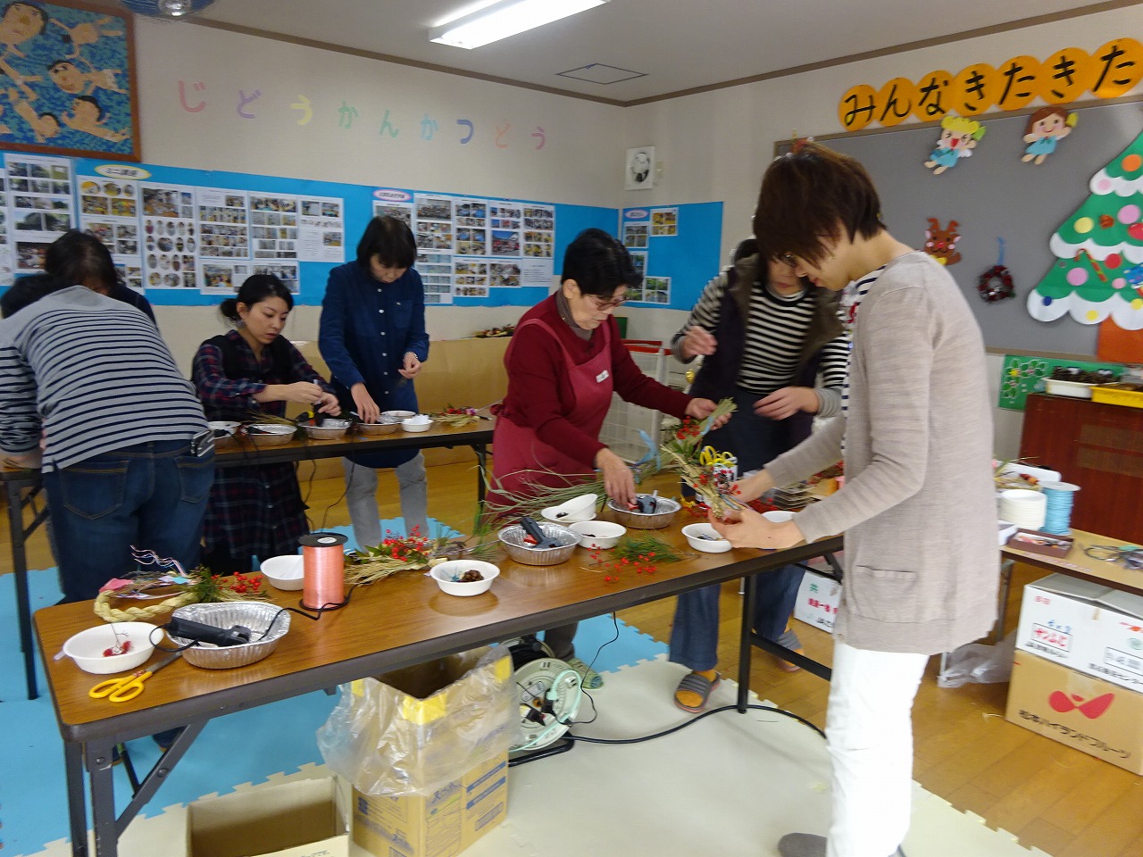 先生は、「南天は難を除き、水引を輪に締めて飾りすべて丸く納まるように。松は一年中青いため不老長寿を願う。」と話しました。 児童館で育てた花も使って、個性あふれるモダンなしめ飾りに仕上げ、参加者は「自分で作ったしめ飾りを家に飾れるので嬉しい。」と話した。