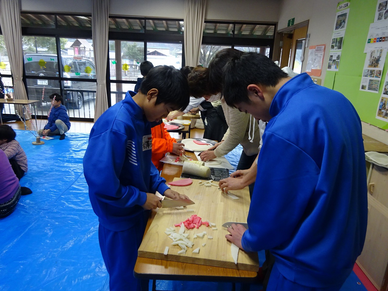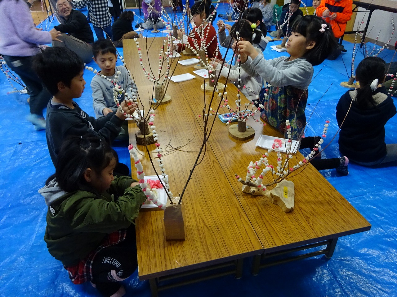 持参した株に、赤や白の短冊に切った餅を巻きました。枝いっぱいに餅を付けたりと個性豊かな作品に仕上がりました。華やかなお正月の準備ができました。