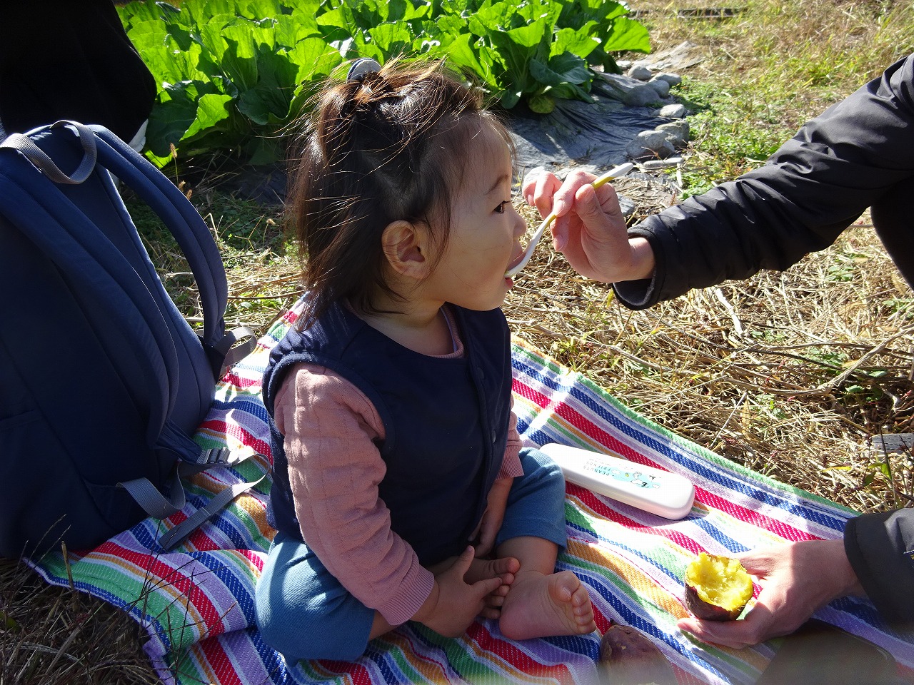 11月25日(金)ひよっこ農園でやきいもを行い5組の親子の参加がありました。とても天気が良く焼き芋日和となりました。もみ殻の中から焼き芋が出てくると「この中で焼いてるの?」と興味津々で見ている姿がありました。青空の下でみんなで食べる焼き芋はとっても美味しかったです。