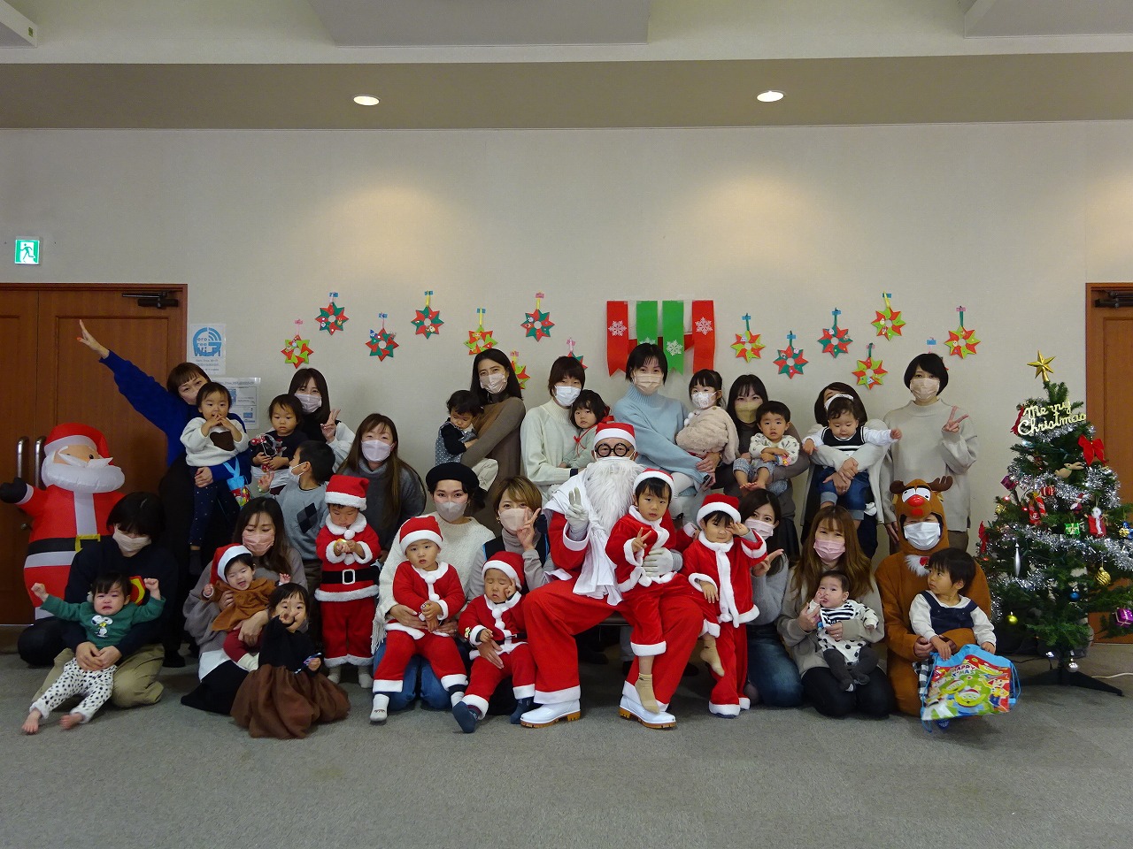 12月9日、ひよこくらぶのクリスマス会があさんず会館で行われました。役員さんが今日のために楽しい企画を準備して下さいました。始めに折り紙のクリスマスリースを作り、職員によるパネルシアターを観た後は待ちに待ったサンタさんとトナカイさんの登場!びっくりして泣いてしまう子もいましたが、とっても嬉しそうな子ども達でした。サンタさんにプレゼントをもらった後は、タンバリン、鈴、カスタネットでみんなでクリスマスソングの演奏をし、サンタさんもトナカイさんも子ども達もノリノリで楽しい時間を過ごすことができました。