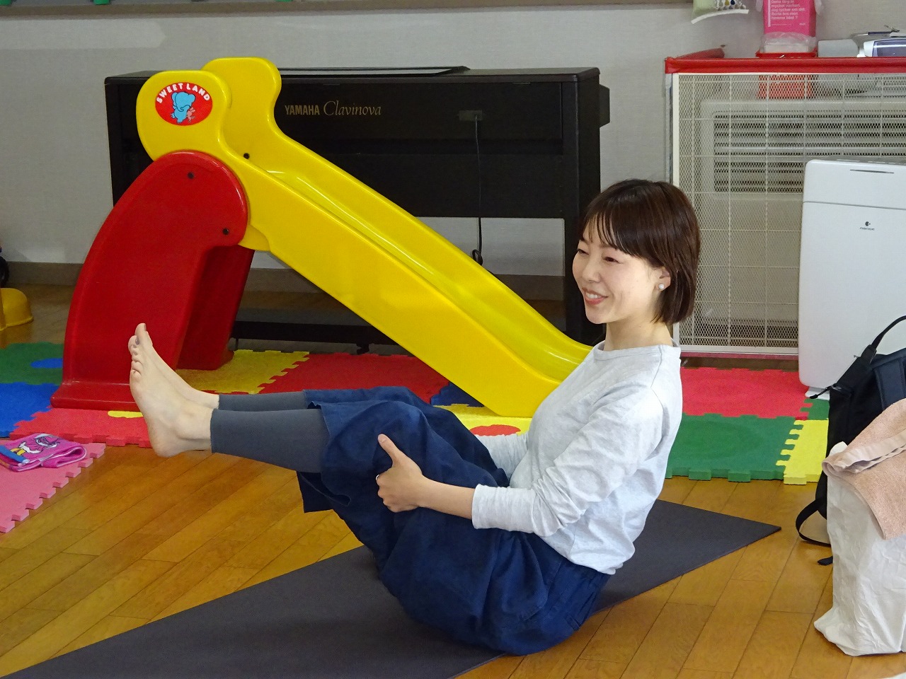 自己紹介をした後、ヨガインストラクターの内木ゆう子さんに、親子でできるヨガやお母さんメインのヨガ等を教えていただきました。一人ひとりの体の状態を聞いて丁寧に教えていただいたので、肩周りや背中、足、内蔵がじわじわと温まり、心も体もリラックスでき、楽しいひと時でした。子どもと一緒に、忙しい育児や家事の合間に取り入れ、自分の体を大事にしてほしいなと思います。「またやってほしい」「定期的にやってほしい」と大好評でした。