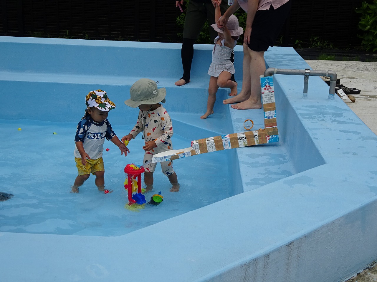 7月19日(水)馬瀬、萩原子育て支援センター、北児童館コラボ企画で『馬瀬のプールであそぼう』を行い、8組の親子が参加されました。 絵本を見て真似をして体操をしてからプールへ。金魚すくい等おもちゃで遊んだり、大きい方のプールでわにさん泳ぎに挑戦したりとみんな思い思いに楽しんでいました。途中みなみこども園のおひさま農園で採れたスイカも食べ、満足そうでした。