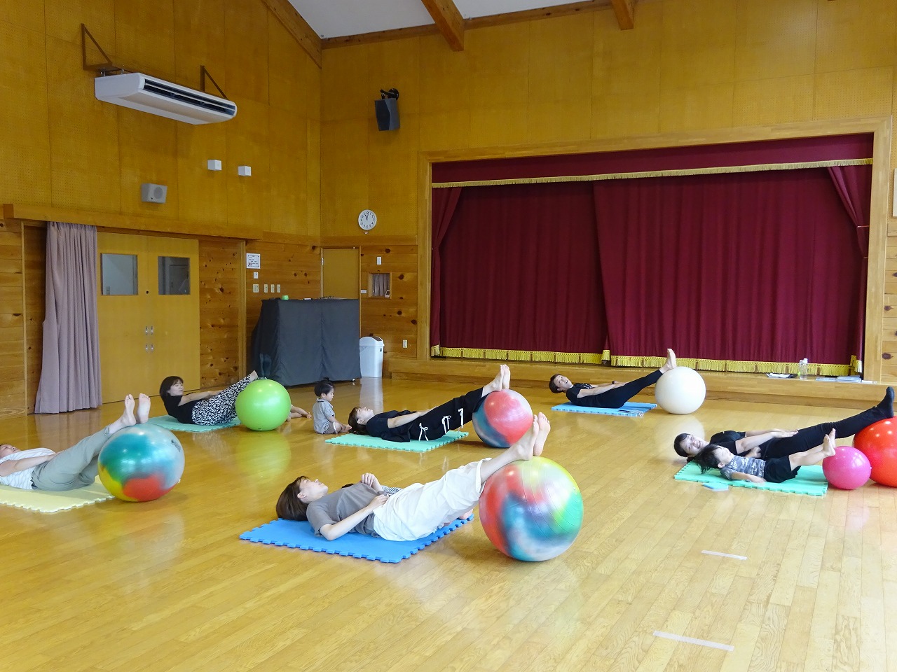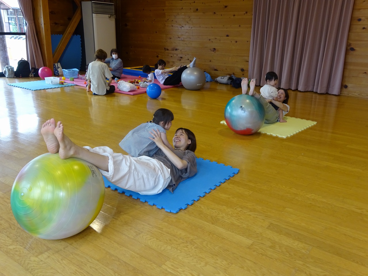 この日はきたこども園の遊戯室を借りて、親子でバランスボールを楽しみました。大人のボールの一回り小さなバランスボールに2歳,3歳の子も座りお母さんと一緒にポンポン!と弾み、とても楽しそうでした。家では毎日の子育てでなかなか自分の時間が取れないお母さんたちも、この日は自分時間を楽しみ、気持ちの良い汗を流しました。次の日の筋肉痛は大丈夫だったかな?お子さんとの時間ももちろん大切ですが、お母さんの時間も作れるような企画をこれからも考えていきたいと思います。