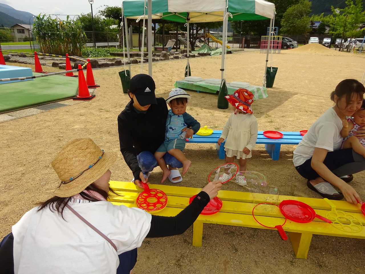 今月の園庭開放は、隣接するこども園の大きなプールを借りて水あそびを楽しみました。大きなプールでは、怖がることもなく、お母さんと一緒に水の感触を味わい、心地よさを感じることができました。またこども園のお兄さんやお姉さんと一緒に、シャボン玉やかたくり粉粘土あそびをして、初めての「トロトロ」「ツルツル」といったかたくり粉の感触あそびを経験し楽しみました。
