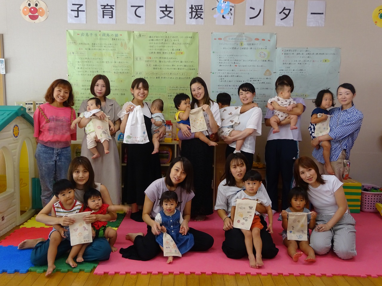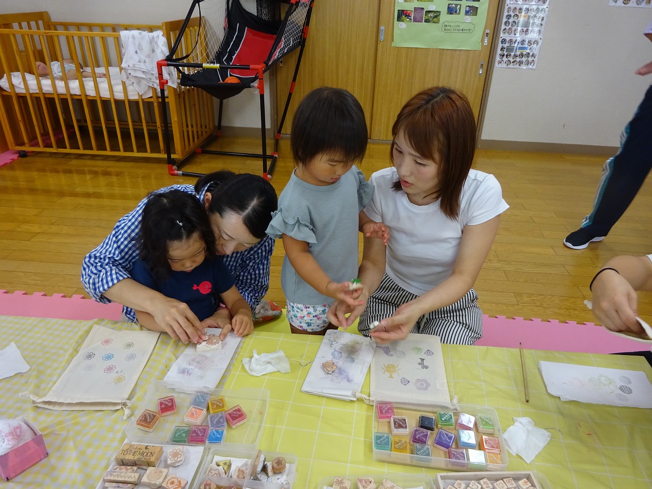 世界にたった一つのオリジナル巾着!3歳のお子さんは自分の好きな消しゴムハンコと、好きな色スタンプを選び、巾着袋に押していきました。どの親子さんもお子さんとの会話を楽しみながら、そして真剣に製作を楽しんでいました。個性豊かな素敵な巾着の完成に、帰る時には手に大事そうに持って帰るかわいらしい姿がありました。