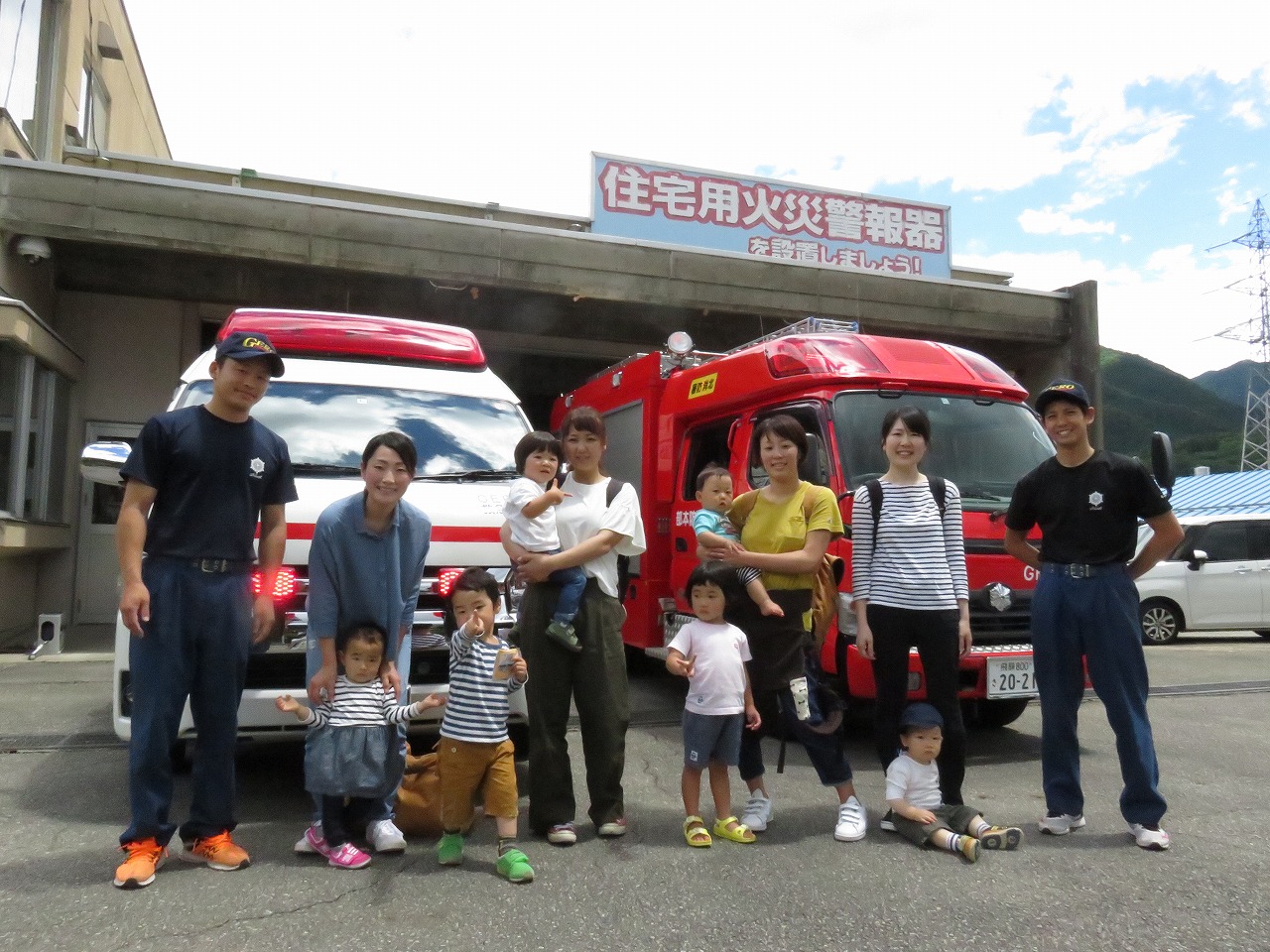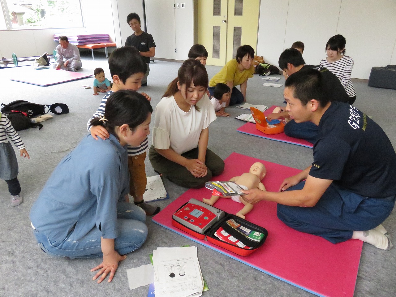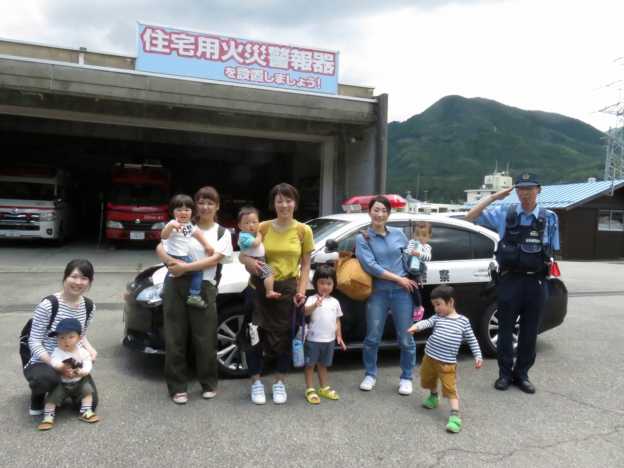 馬瀬乳幼児学級では、毎年救急救命講習を受講しています。 今年は心肺蘇生術とAEDの操作方法も教えていただき、誤飲時の対処方法なども習いました。 その後、緊急車両を見せていただき、実際にはしごをかけて高所救助の手順などを見せていただくことができました。 子ども達も緊急車両には大喜びで、偶然来署された警察官のパトカー見学もさせていただくことができ、お母さんも興味深々でパトカーのトランクに入っているものなどを見せていただいていました。