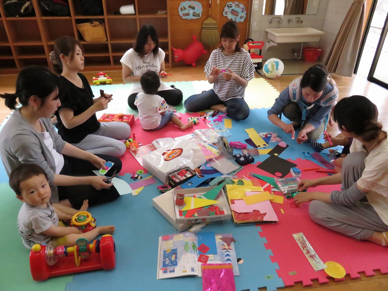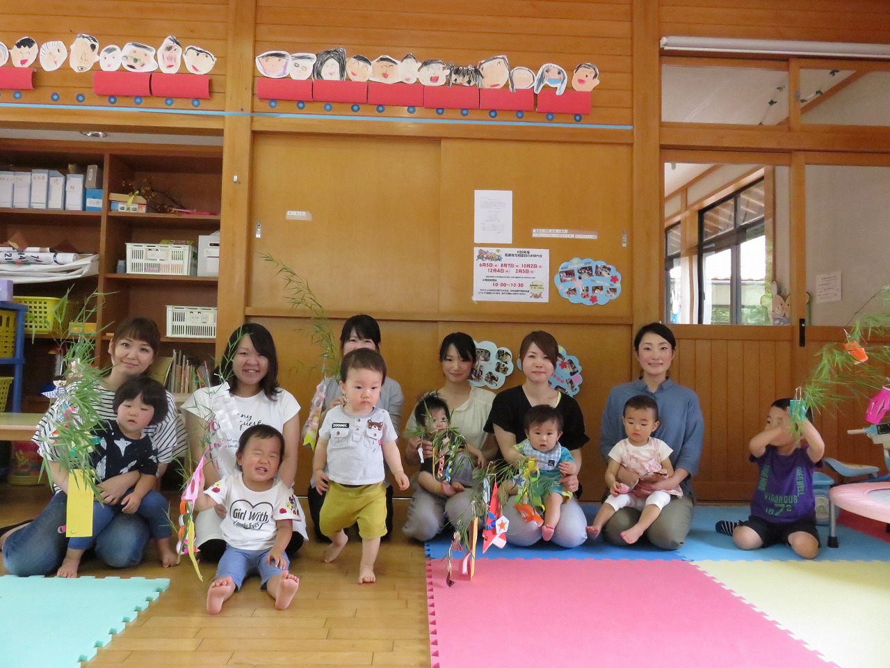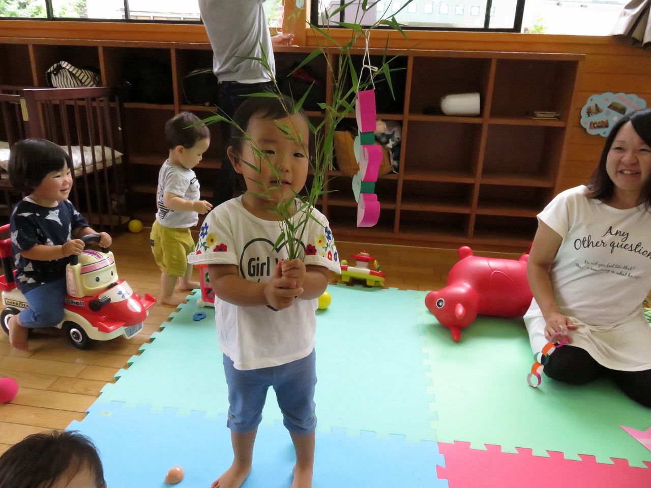 役員さんが準備された笹の葉に、七夕飾りを飾り付けました。 本を参考に、折り紙や画用紙を使って、可愛い七夕飾りがたくさん出来ていました。 子ども達は、トランポリンやおままごとあそびを楽しみ、 自分より年下の子を可愛がる姿も見られるようになりました。 完成した七夕飾りは、それぞれ自宅に持ち帰り玄関先などに飾られました。
