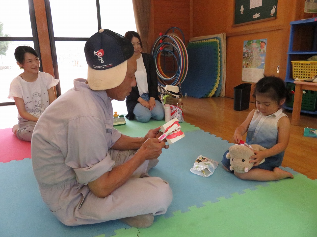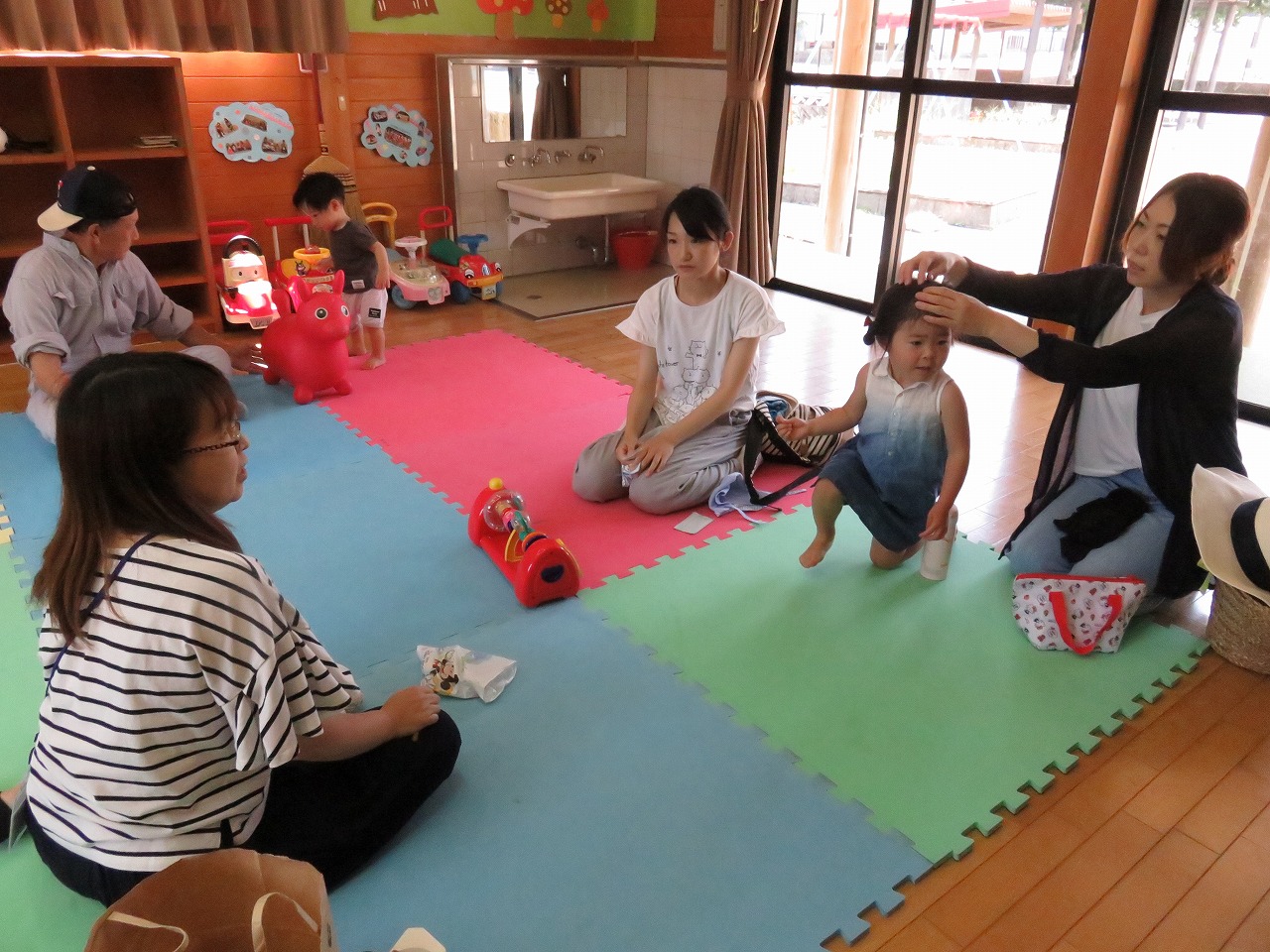 乳歯の生え始めの歯磨き方法や、歯磨き粉についてなど 参加されたお母さん方は真剣に聞き入って見えました。 3歳児の女の子は、実際に歯磨きをする様子を講師に見ていただき ガラガラも上手に出来ていました。