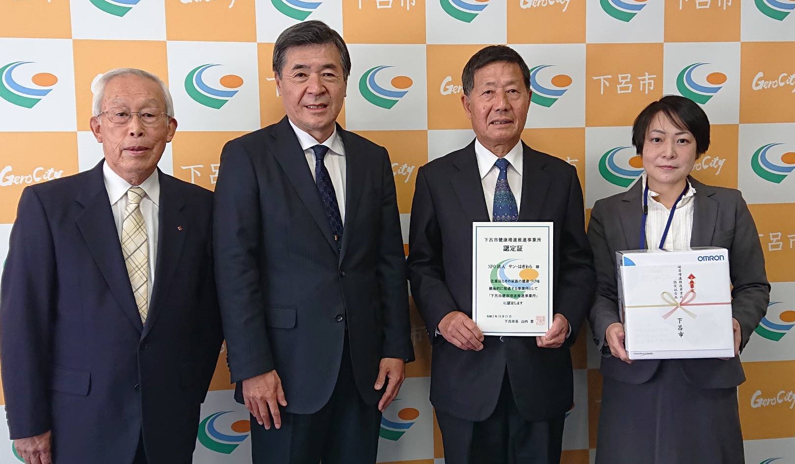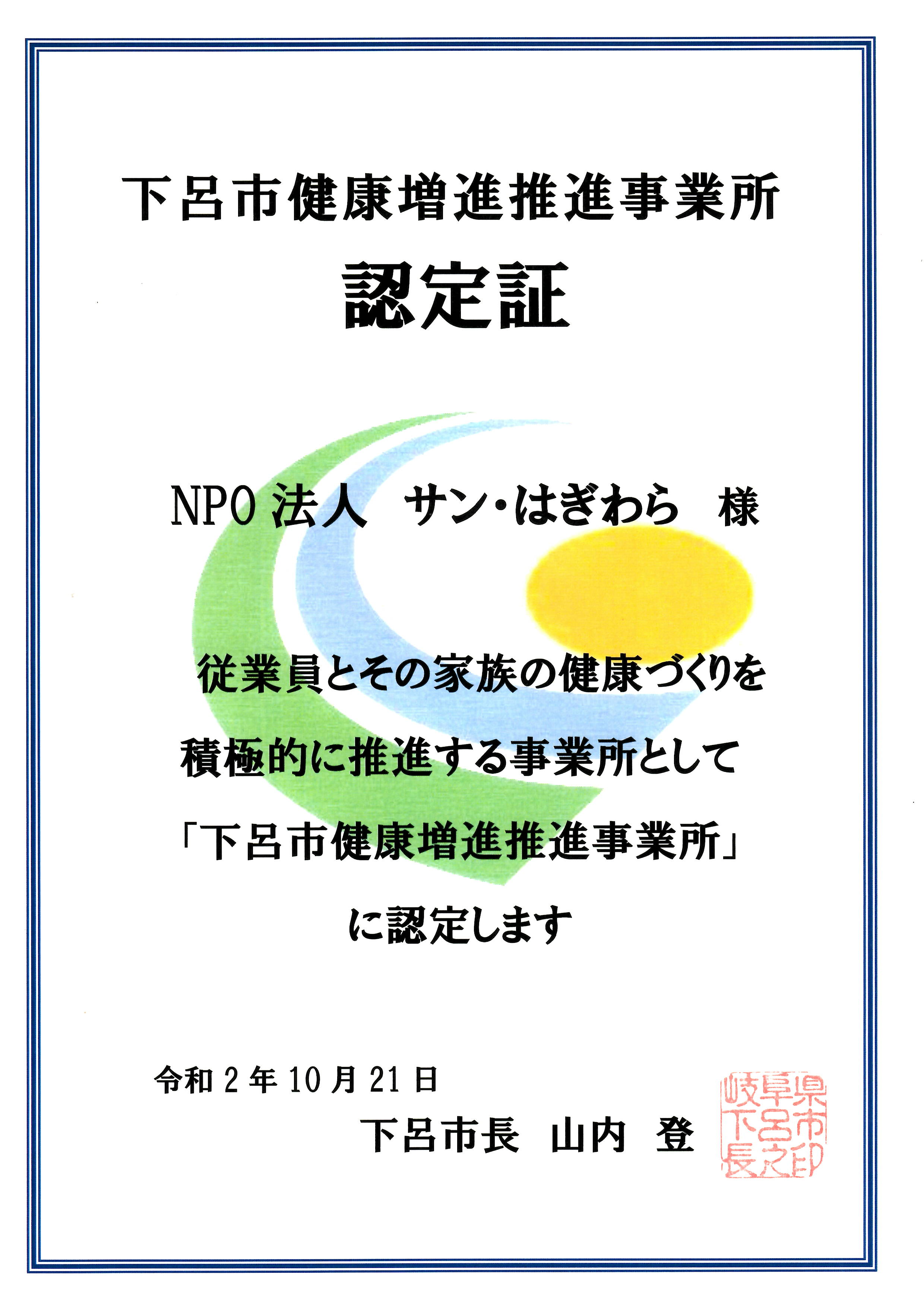この度、NPO法人サンはぎわらは 社員の健康を考え、健康増進を積極的に行っている事業所として 「下呂市健康増進推進事業所」の認定を受けました