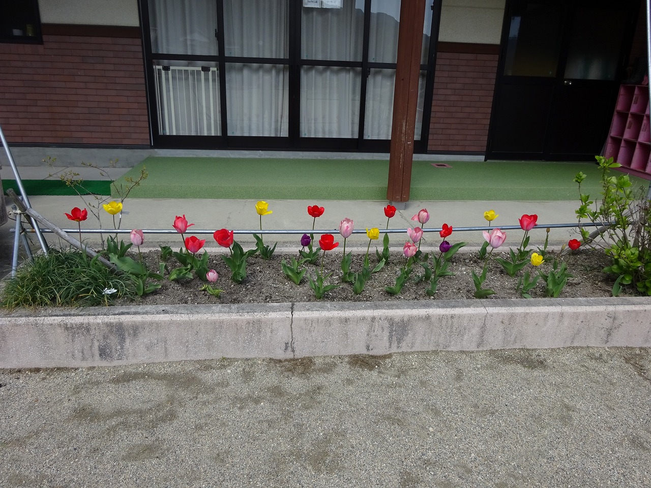 年長さんが、年中の冬に球根を植えてくれたちゅうりっぷがきれいに咲きました。赤・ピンク・黄色・紫いろんな色が並んでとってもきれいです。