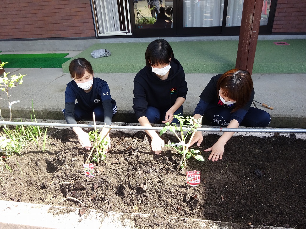 こども園がお休みの間に、未満児さんの先生たちでミニトマトの苗植えと、ひまわりの種植えをしました。