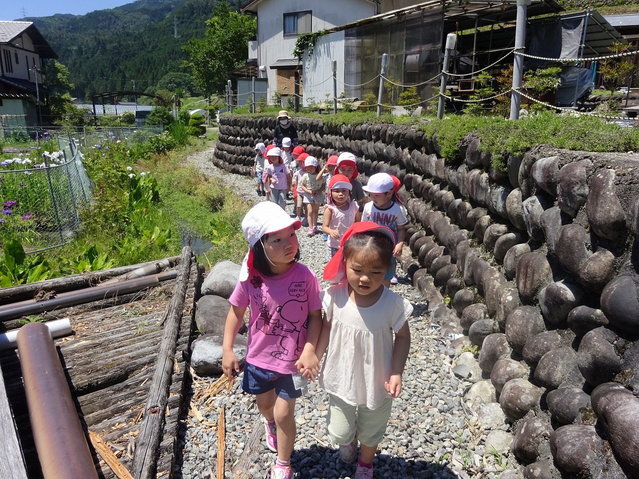 途中で田んぼの中のオタマジャクシを覗き込んでみたり、紫陽花や朴葉を見たりと季節を感じることができました。また、池には鯉がいたので、うれしそうにずっと見つめている子もいました。さすが年中さん、年長さん!「右よし左よし」と安全確認もしっかりして、最後まで元気に歩きました。