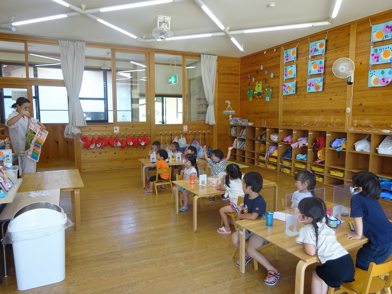 今年度はじめての『食育の日』です。毎月『食育の日』には、身体測定の他に、栄養士が来て、食育についての話をしたり、クイズを出したりしてくれます。