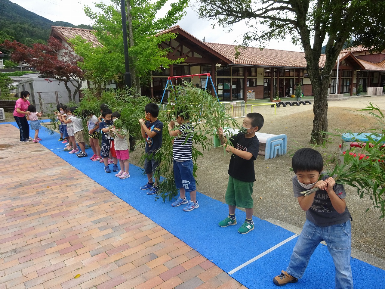 代表で年長さんが受け取って運んでくれました。「きれいに飾ってお家に持って帰ってね」と年長さん一人ひとりに手渡してくださいました。持ち帰り用の笹を全園児分いただき、最後に園に飾る用の特大の笹もいただいて、みんなで運びました。「わっしょい、わっしょい」「大き〜い」と大喜びで運んでくれました。お忙しいところ子どもたちのために運んでくださった野上区長さん、ありがとうございました。