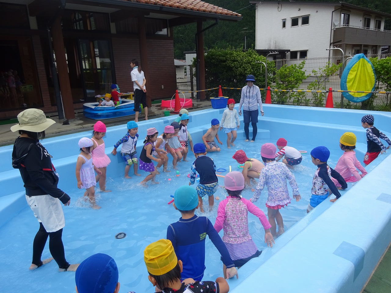 晴れたり曇ったりの少し不安定な天気でしたが、一日遅れのプール開きができました。「今日プール入れる?」「やった〜!」とプールを楽しみに登園してくる子がたくさんいました。