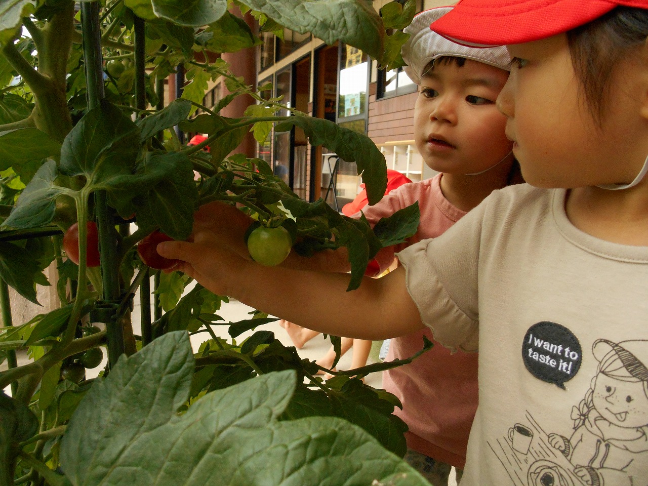 たくさん収穫できる日もあれば、ちょっとだけの日もありますが、順番に採って食べています。収穫したトマトは「洗ってください」と給食室へ持って行き、給食の先生が洗ったり切ったりしてくれます。トマト大好きな子は「おいし〜い!もっと食べた〜い!」ちょっぴり苦手な子も「こども園のは甘くておいしい」と言って喜んで食べています。次の順番を楽しみに待っている子どもたちです。