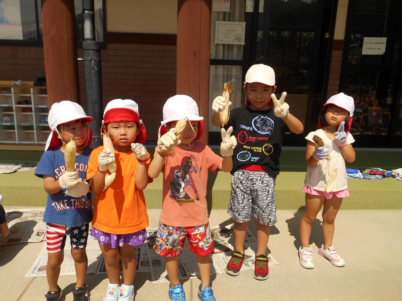 ずっと収穫を楽しみにしていた年中さん。今日は暑い中でしたが、自分の手でトウモロコシを採り皮をむいて、吊るして乾燥させる準備をしました。クッキングまではまだ少しかかりますが、とっても楽しみにしている子どもたちです。