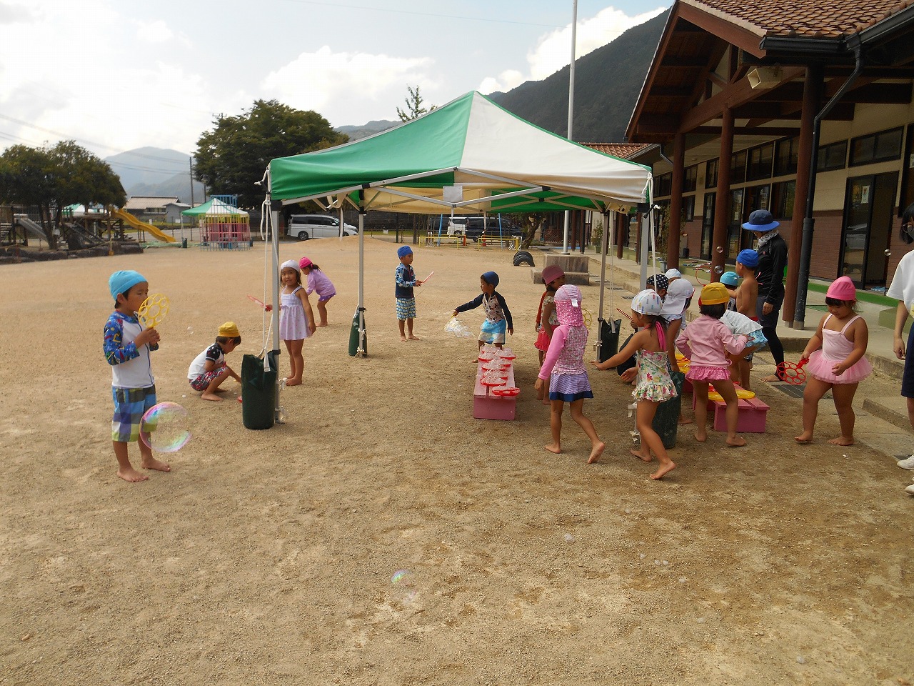 年中さんがシャボン玉あそびをしました。今回は、ストロータイプの道具は使わず、バブルリングを使いました。