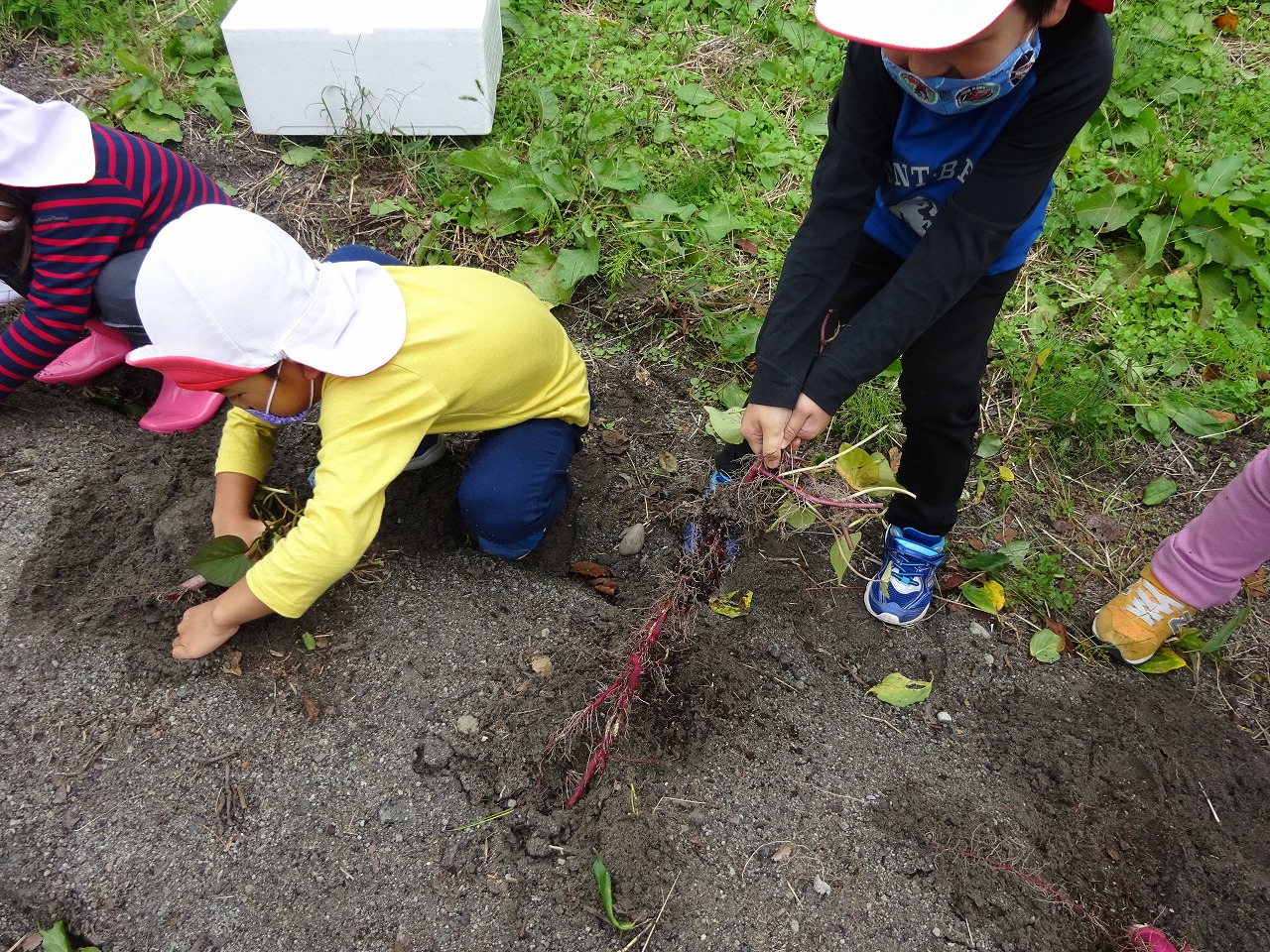 年少・年中さんはバスで行き、芋掘り体験をさせていただきました。はじめは、やり方が分からなかったり土を掘ることに思い切れない子もいましたが、飛騨川の方に習いながら収穫することができました。