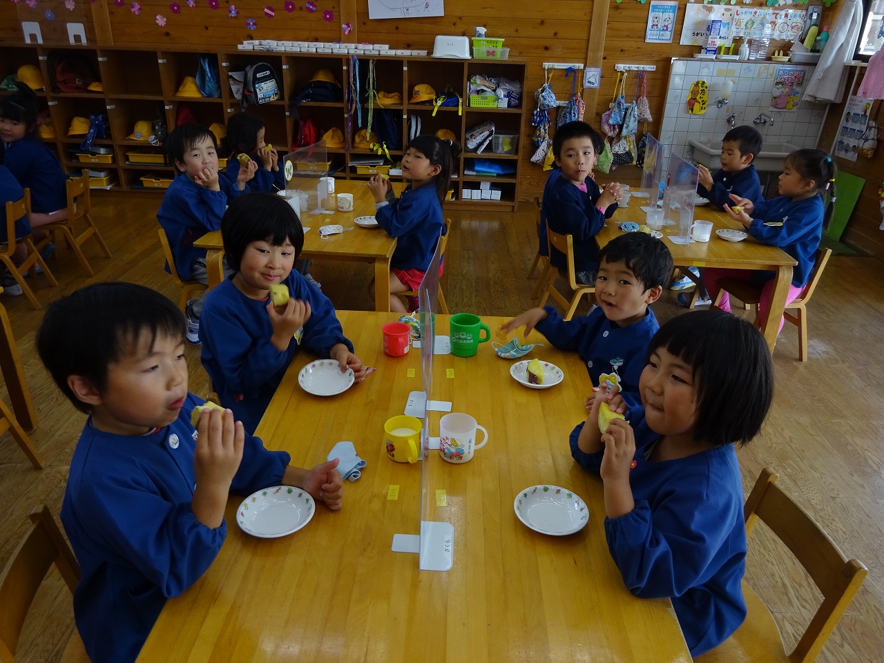 「このお芋はどこで掘れたお芋でしょうか?」「飛騨川公園!」とすぐに正解でした。子どもたちも楽しみにしていたようです。「あま〜い」「おいし〜い」と大喜びで食べました。こども園の芋掘り、焼き芋も楽しみです。