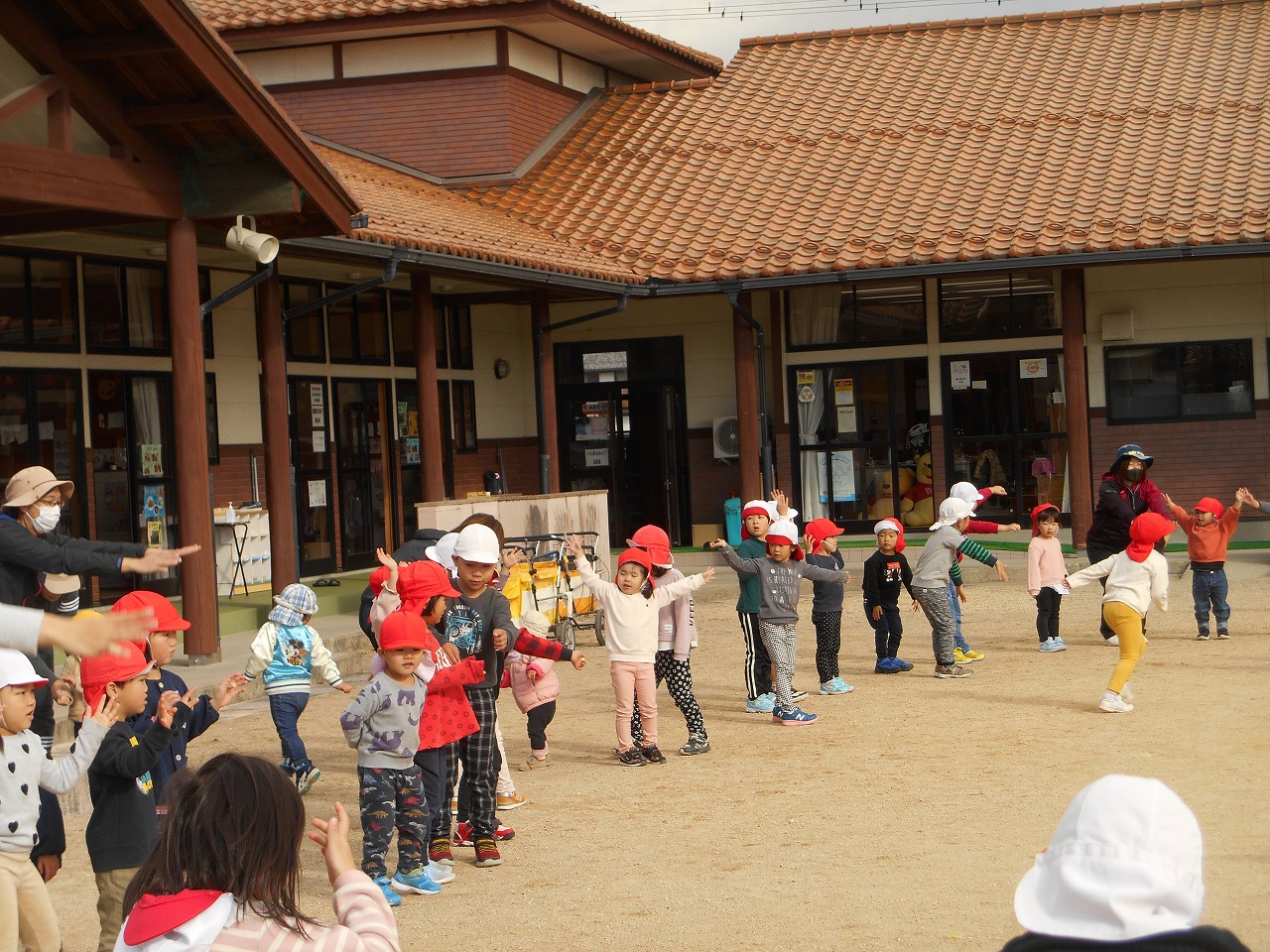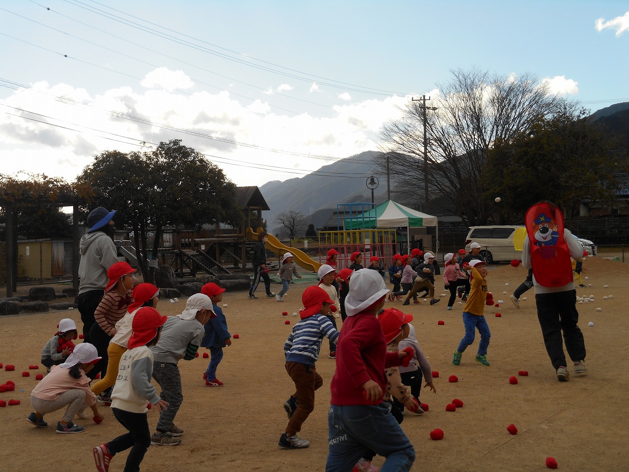 全園児が園庭に集まり、年中さん1名、年少さん1名、未満児さん2名のお祝いをしました。誕生日のお友だちにインタビューをしたあと大好きな「どんぐり体操」で体を温め、今回のお楽しみはたてわり活動のグループ対抗で「追いかけ玉入れ」を行いました。