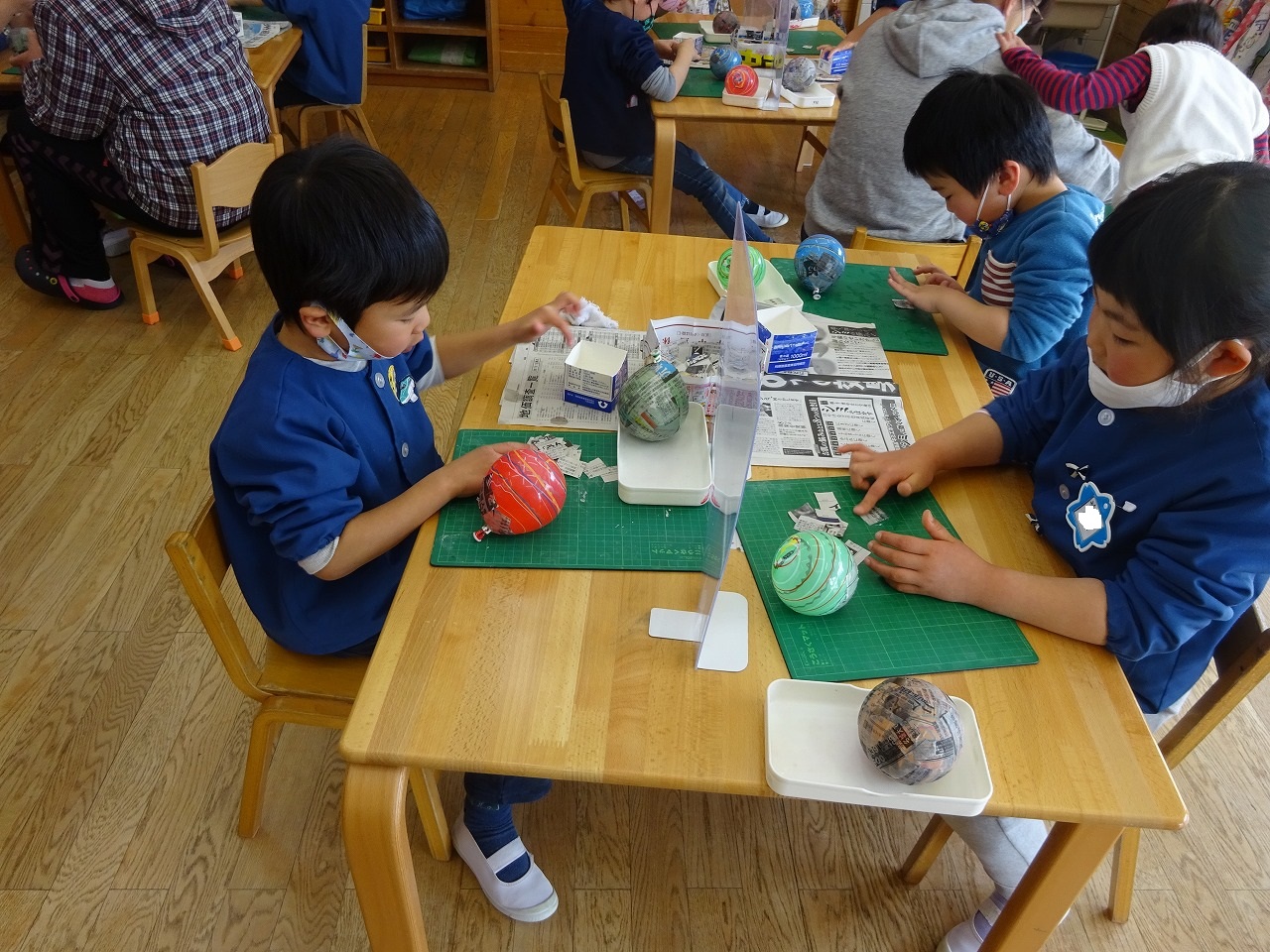 年少組・年中組は紙粘土を使って作り、年長組は、ヨーヨー釣りで使う風船に紙を何層も張って作っていきます。どのひな人形も一日ではできない根気のいる作業ですが、みんな完成を楽しみに毎日少しずつ取り組んでいます。