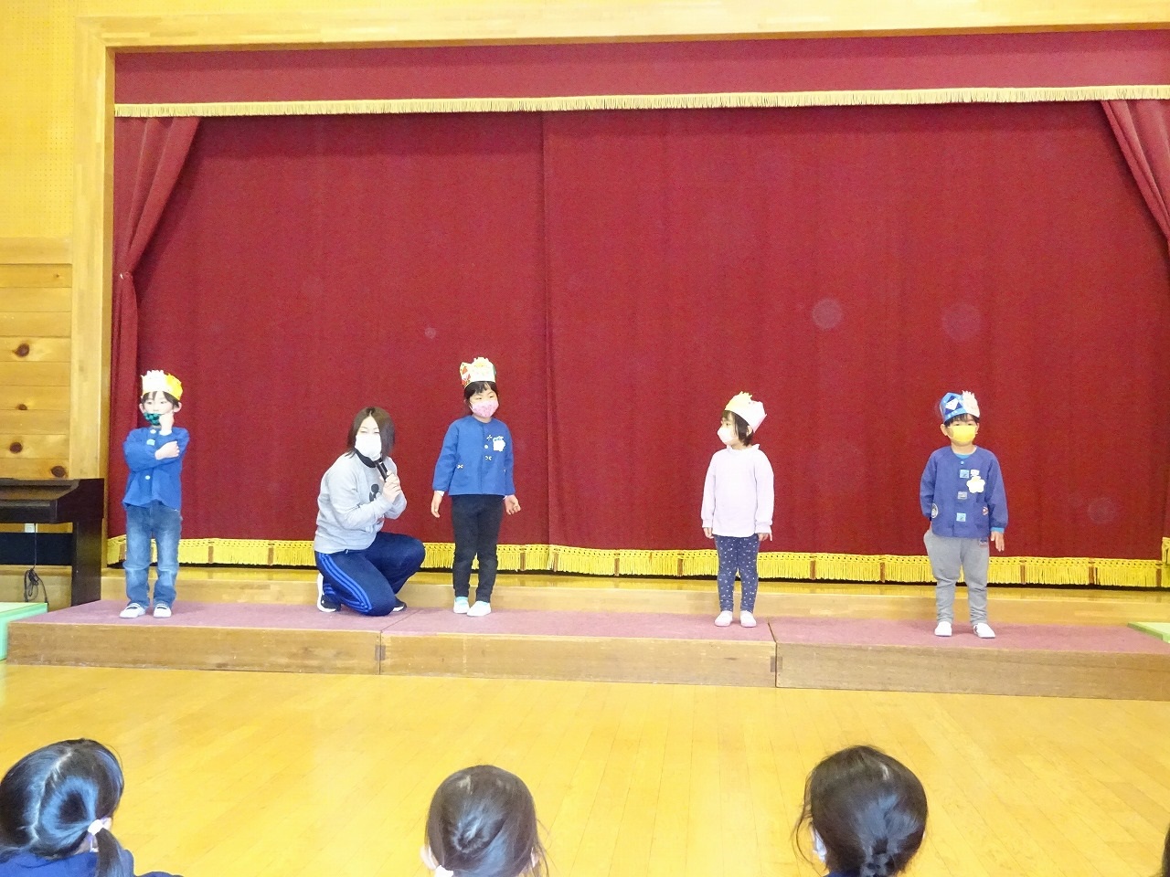 インタビューの後のお楽しみは「にんじんさんはなぜあかい」のペープサートを観ました。観終わった後は人参が赤い理由をちゃんとお話してくれた子どもたちです。今回は実習の先生の手あそびもあり、更に楽しい誕生会になりました。
