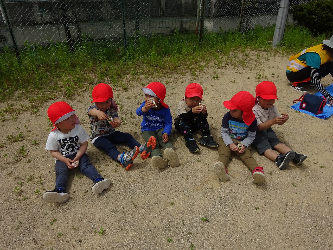 例年なら、年長さんのお兄ちゃん、お姉ちゃんに手を引いてもらって遠足に出かけますが、今回は自分たちだけで頑張って歩きます。列になって歩くことはなかなか難しいため、急きょお散歩ロープをつくりみんなでロープを持って歩きました。現地ではおやつを目がけて走る「おやつレース」を楽しんだ後、おやつを食べました。 園へ戻ると、年少さんは園生活初めてのお弁当。「見て〜」と見せ合いながら、食べるのがもったいない様子でした。