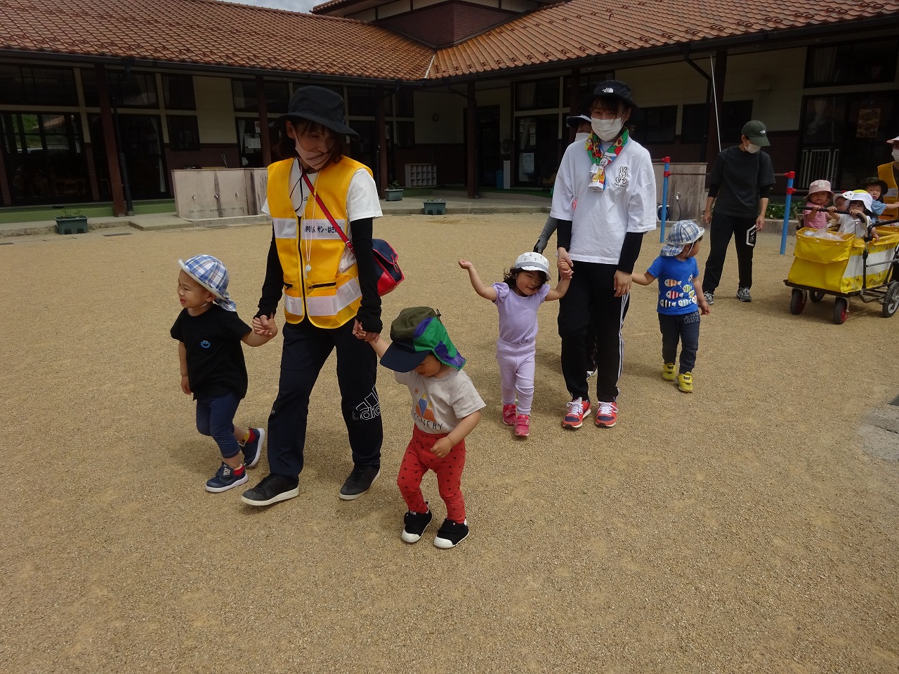 未満児さんは野上公民館の広場に行きました。2歳児さんは保育士と手をつないで歩き、0・1歳児はお散歩カートに乗って行きました。