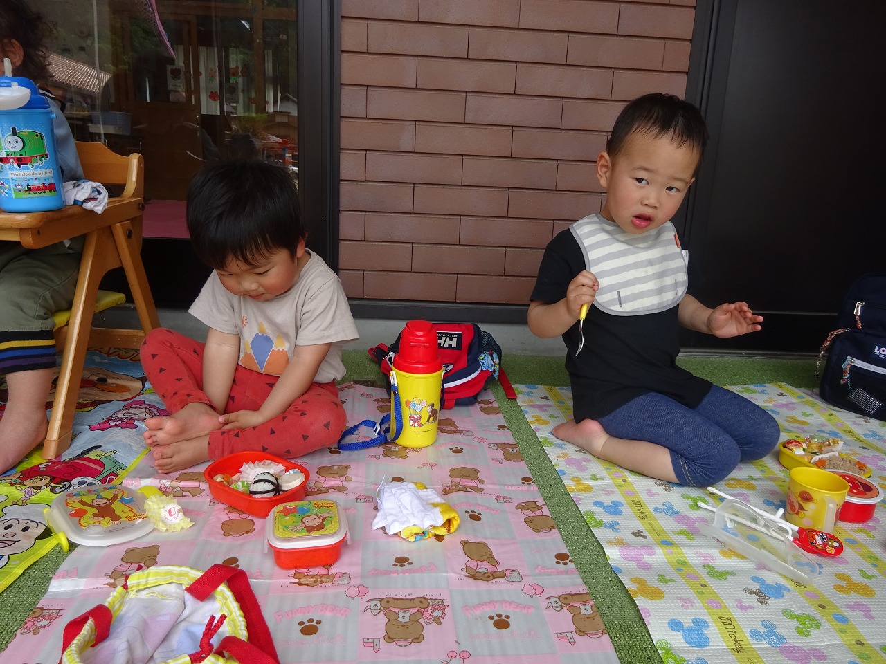広場では、草花を見つけて「きれいだね」と話したり、「タンポポないかなぁ」と探したり、可愛い姿がたくさん見られました。また途中、ヘリコプターが空を飛んでいるのを見つけて大喜び!「お〜い」「ばいば〜い」とみんなで手を振りました。