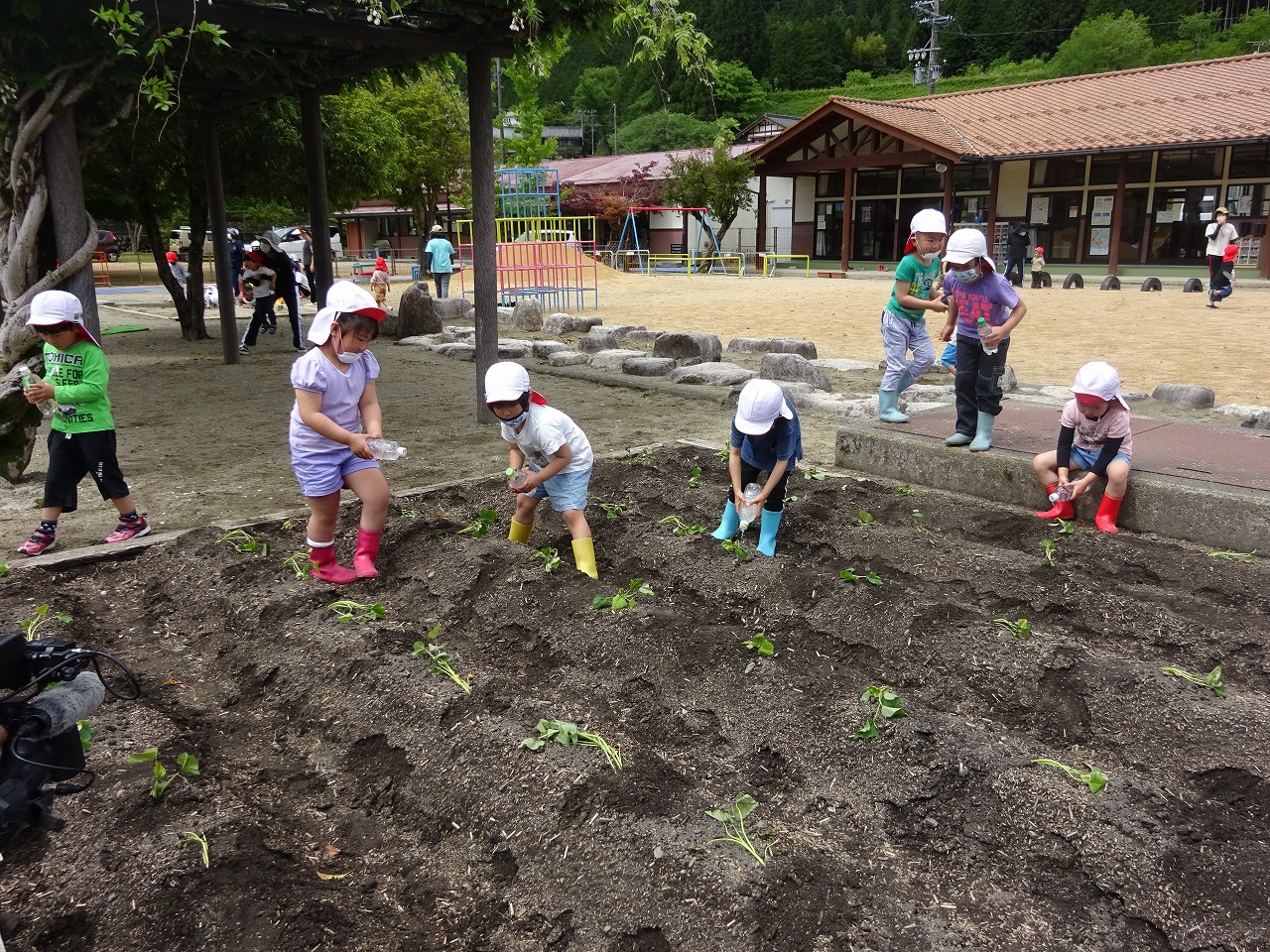 先日耕した畑に、年長さんがさつま芋の苗を植えました。