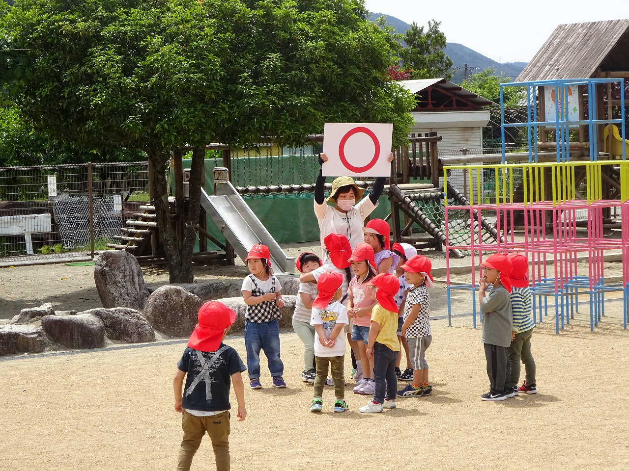 みんなでディズニー体操をした後のお楽しみは〇×クイズ。みんなが知っているアンパンマンのクイズや、今日の給食についてのクイズは子どもたちにとっては簡単だったようですが、難しかったのは、先生たちのフラフープ競争の勝者を予想するクイズです。みんなでいっぱい応援して盛り上がりました。梅雨の晴れ間の良い天気に恵まれ、みんなで楽しい時間を過ごすことができました。