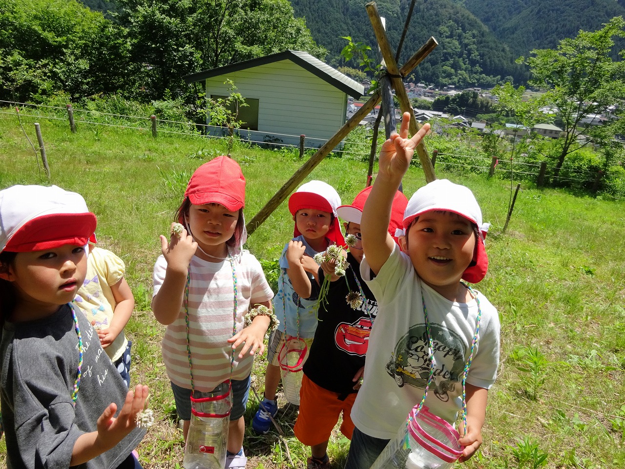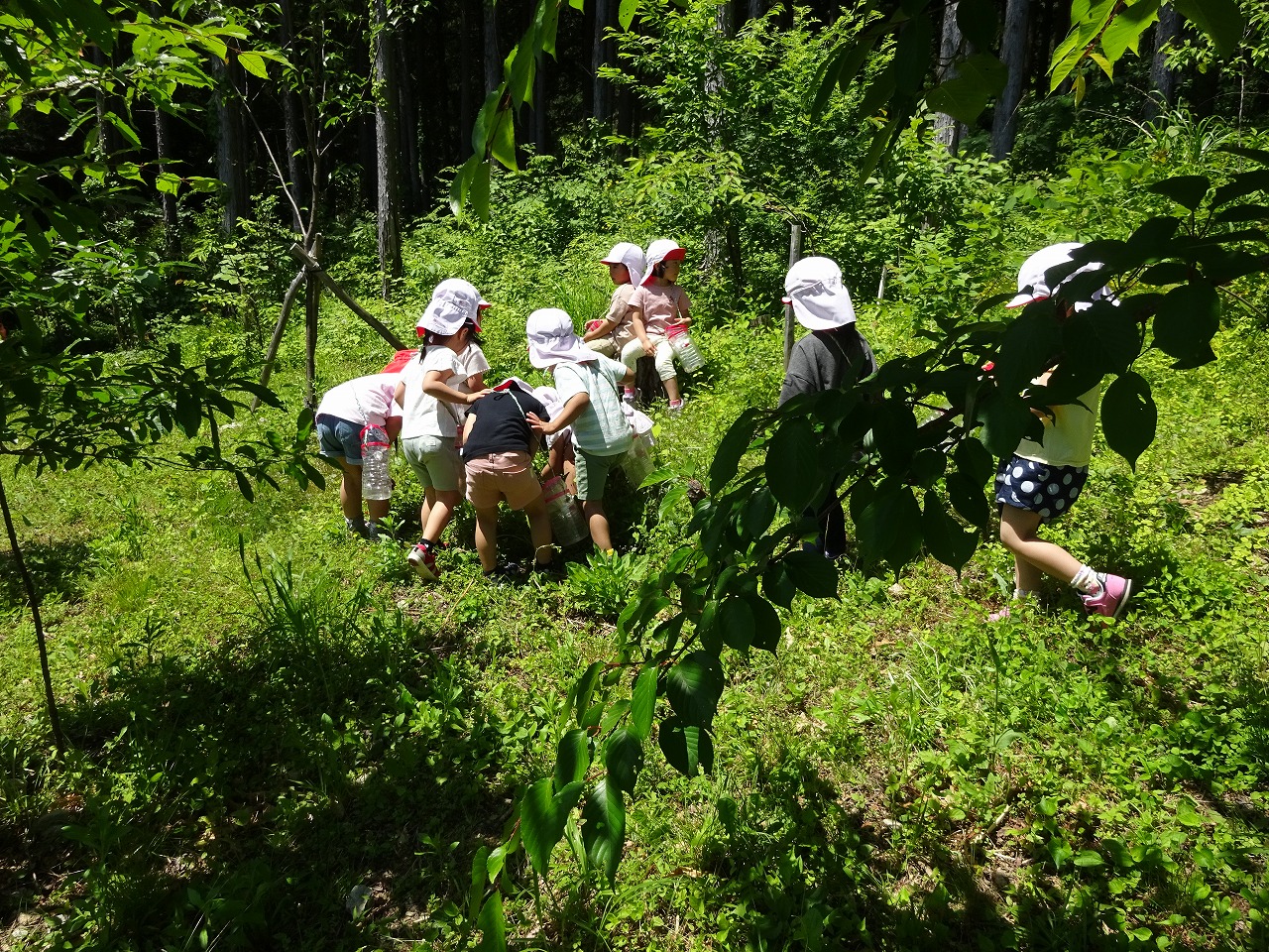 現地では、虫を探したり、面白い形の葉っぱを見つけたり、みんな目を輝かせて走りまわっていました。持参した虫かごにお土産をいっぱい入れて嬉しそうに帰ってきましたよ。