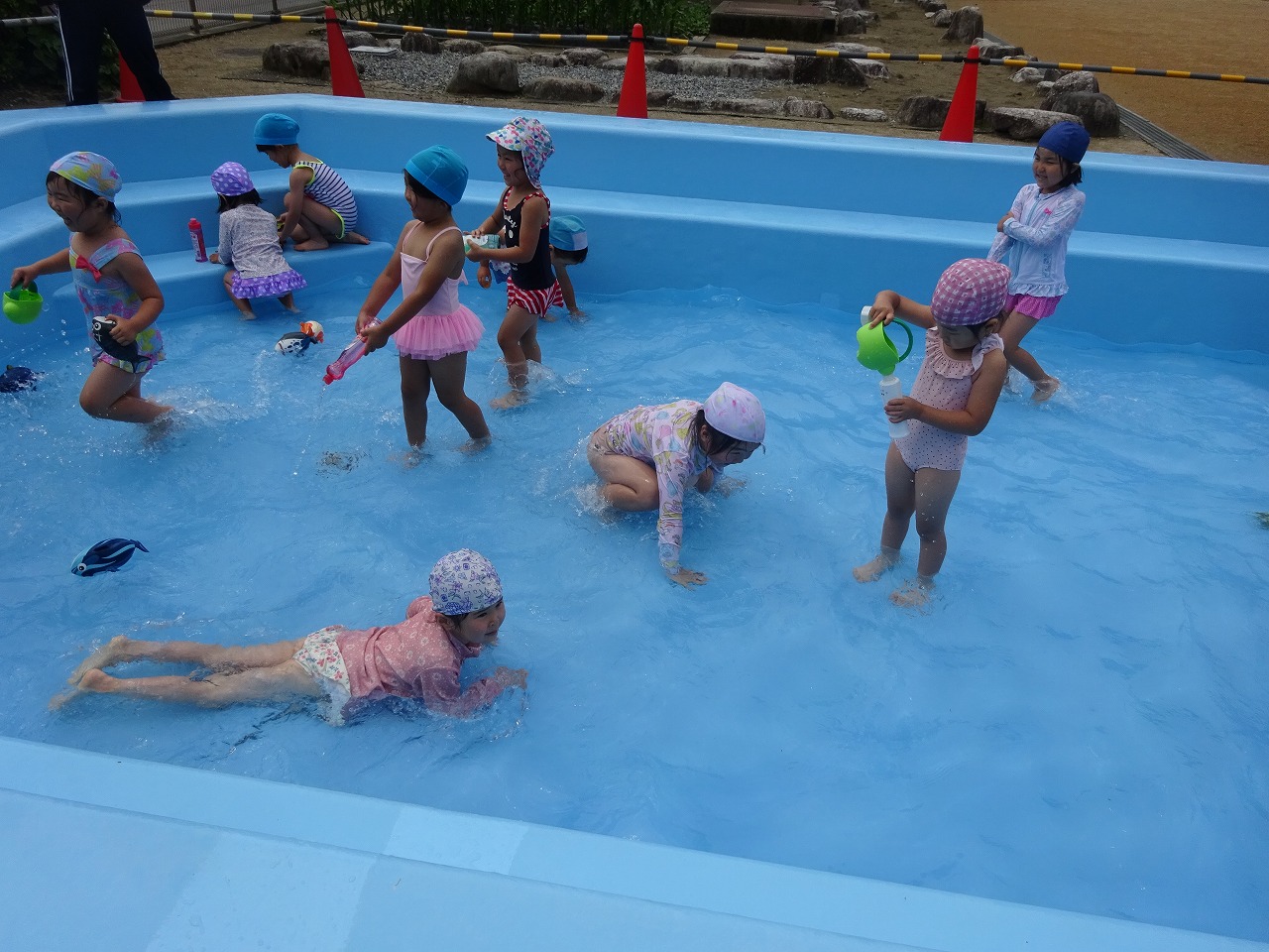 一人ずつ消毒槽に入って数を数えて交代し、プールサイドに間隔を空けて座ることもとてもスムーズでした。おもちゃや持ってきた水鉄砲を使って楽しむと、あっという間に片付けの時間。まだまだ遊んでいたい様子でした。今年の夏もプールあそびがたくさんできるとうれしいです。