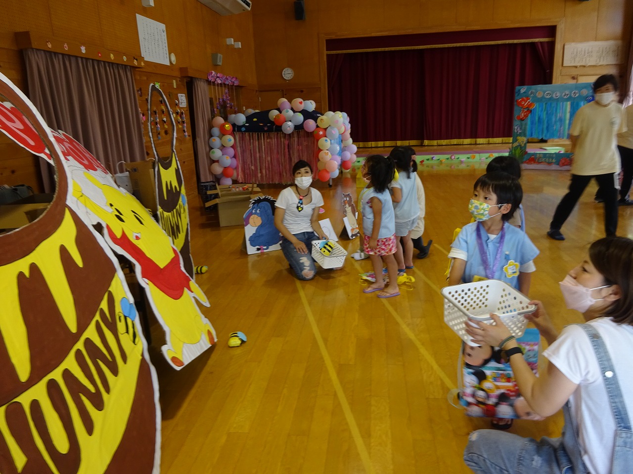 輪投げ・だるま落とし・ゼリーつかみ・・・ハニーポット目掛けて蜂のボールを投げるコーナーもありました。 特大のフォトフレームの中で写真撮影をするスポットも大喜びでしたよ。たくさんのお土産をディズニーのバックに入れて大満足の子どもたちでした。