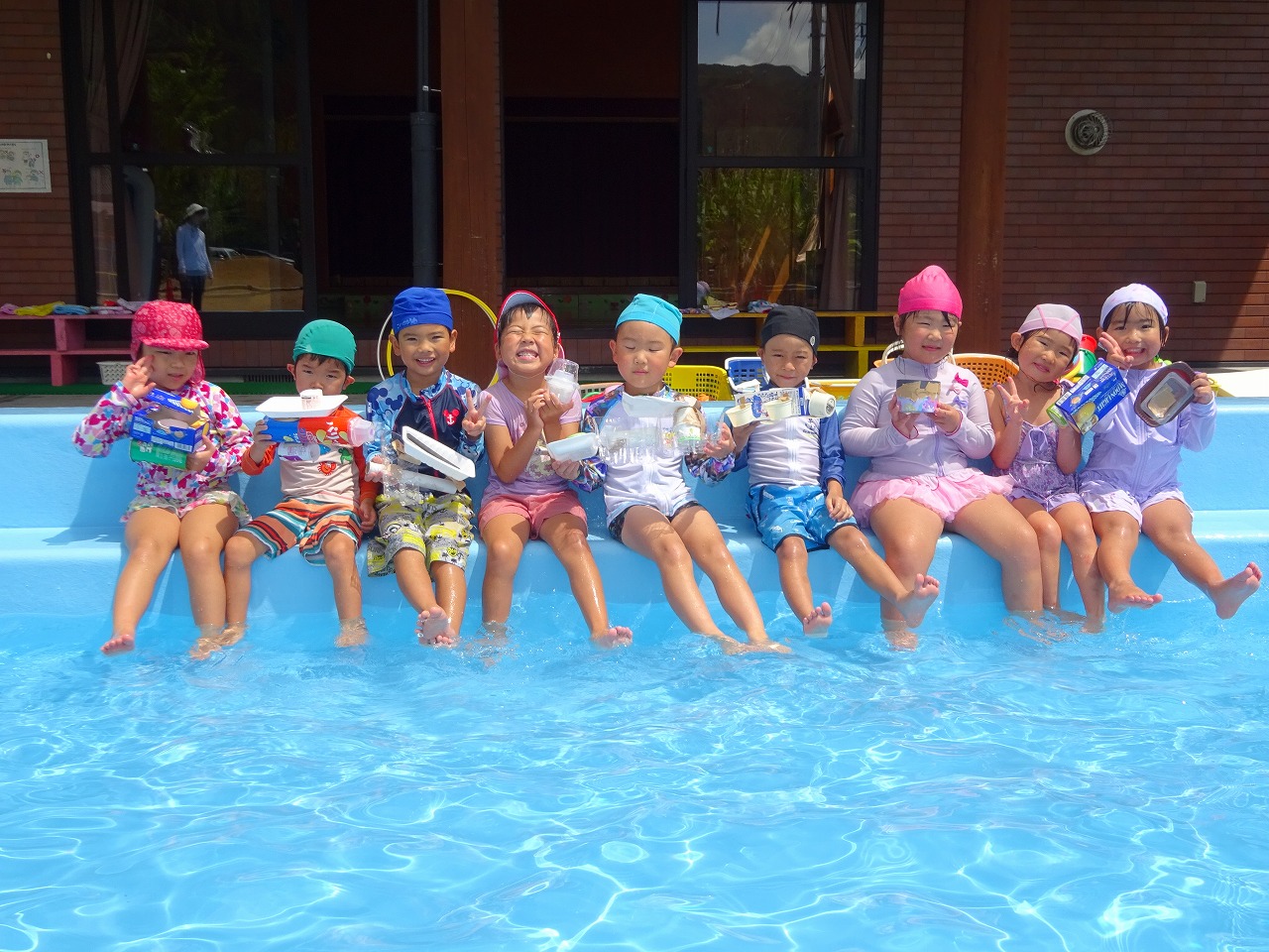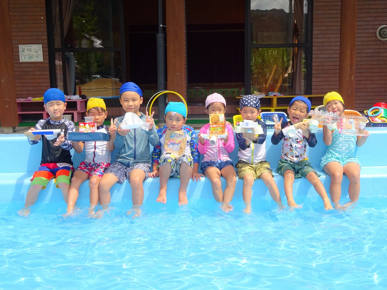 「どんな形が浮かぶかな」「何で作ったら丈夫かな」と考えて、みんな違ったステキな船が完成。いよいよ今日はプールに浮かべてあそびました。「わ〜、浮かんだ」「あれ、倒れちゃった」「壊れた〜」などいろんな声が聞こえてきましたが、みんな浮かべてみることを楽しみにしていたので大満足の表情でした。今日の反省を生かしてまた再挑戦できるといいね。