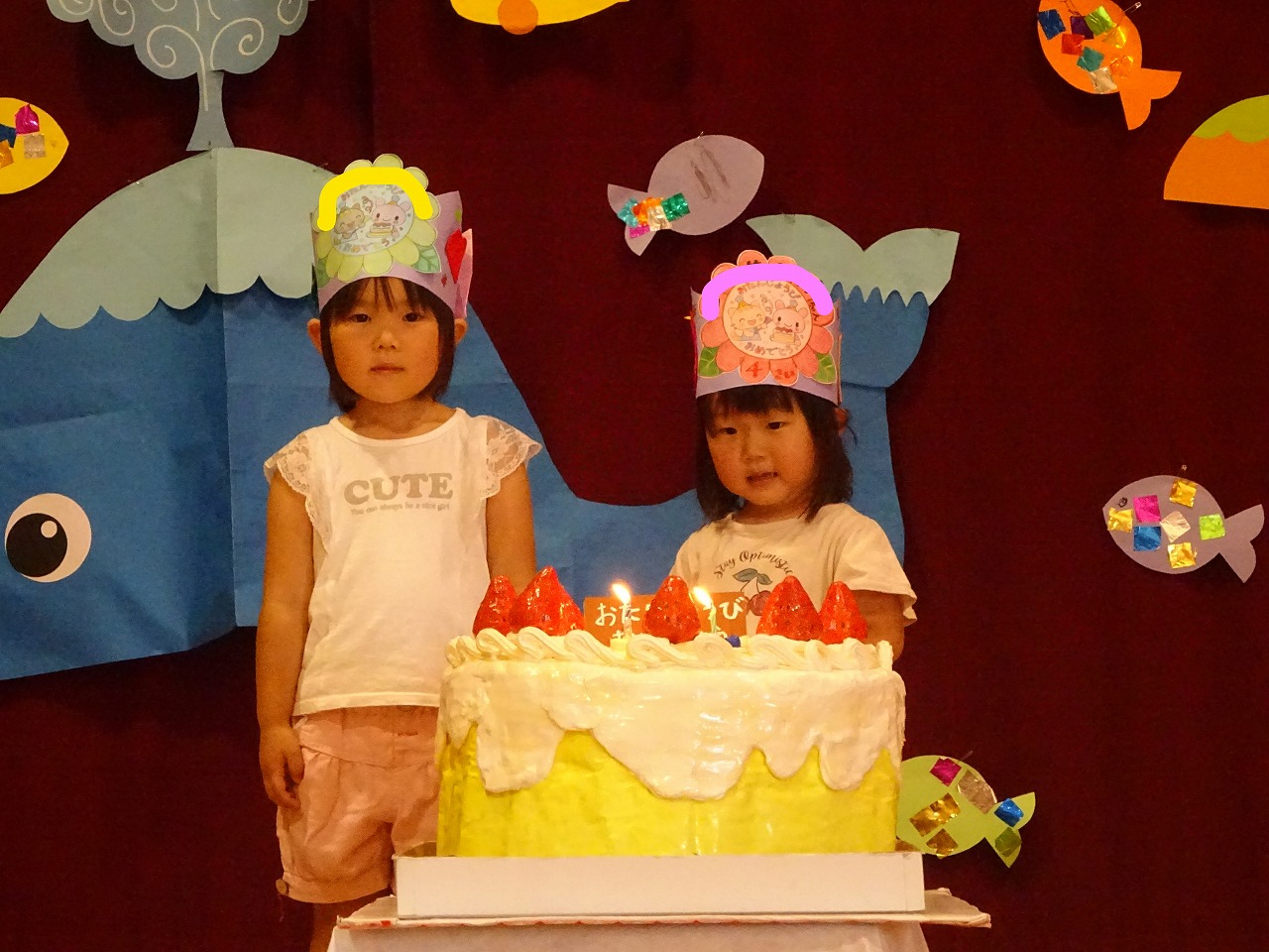 8月うまれのお友だちは年少組2名でした。今日は、年少さんと未満児さんが集まってお祝いをしました。