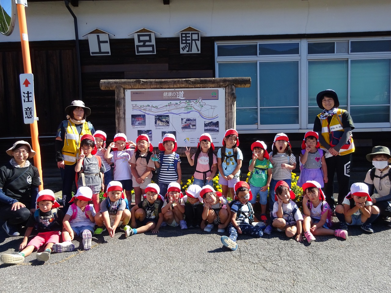 年長組は伏見稲荷大社から白王神社へ、年中組は上呂駅からこども広場へ、年少組は森のようちえんへ、未満児組は北中学校へ行きました。