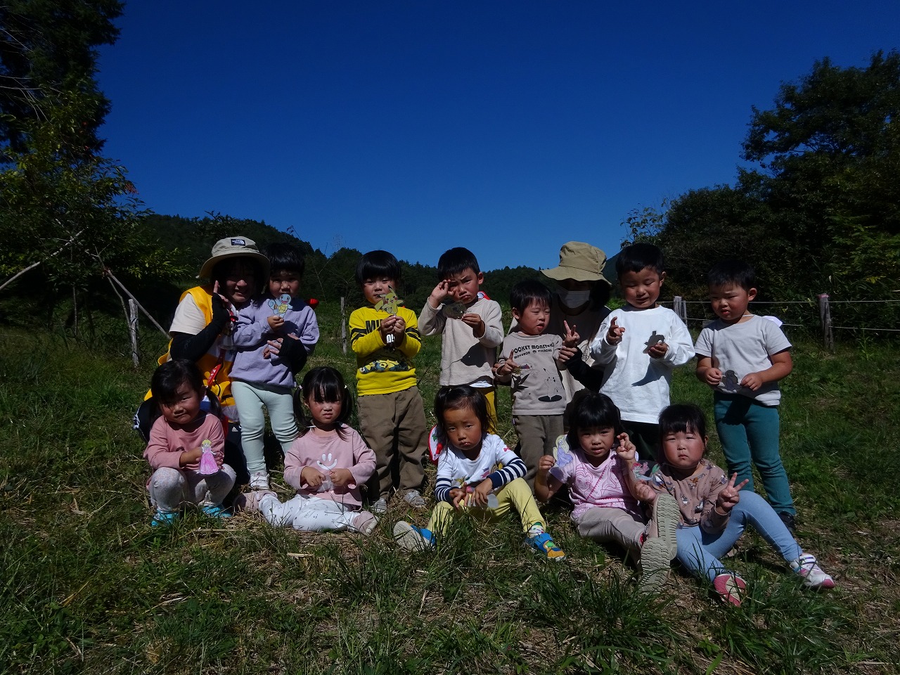 良い天気に恵まれ、秋の自然物をたくさん拾って楽しんでくることができました。何といっても一番のお楽しみはお弁当!!行きの道から「お腹すいた〜」「お弁当は〜?」とみんな待ち遠しい様子でした。みんなでうれしそうにお弁当を見せ合う様子が可愛かったです。朝早くから愛情たっぷりのお弁当を作ってくださりありがとうございました。