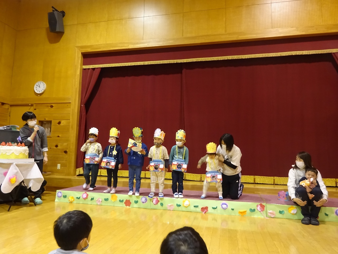 年長さん1名、年中さん2名、年少さん2名、未満児さん2名のお祝いをしました。みんな元気にインタビューに答えてくれた後はお楽しみの時間!