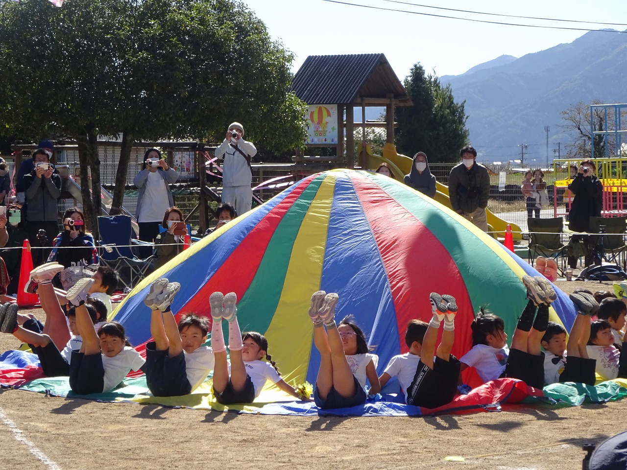 年少さんは可愛く『エビカニクス』を踊りました。初めての運動会でしたが最後まで笑顔で頑張ることができました。年中さんはポンポンを持って『サザエさん』を踊りました。自分たちで隊形移動をし、列も揃えることができるようになり、大きな成長を感じます。そして、こども園最後の運動会だった年長さん。バルーンでは、みんなで心をひとつにし、声を合わせながらすばらしい演技を見せてくれました。運動会への取り組みを通して、苦手なことにも挑戦してできることが増え、大きな自信をつけた子どもたち。様々な場面でやる気が見られるようになり今後がますます楽しみです。