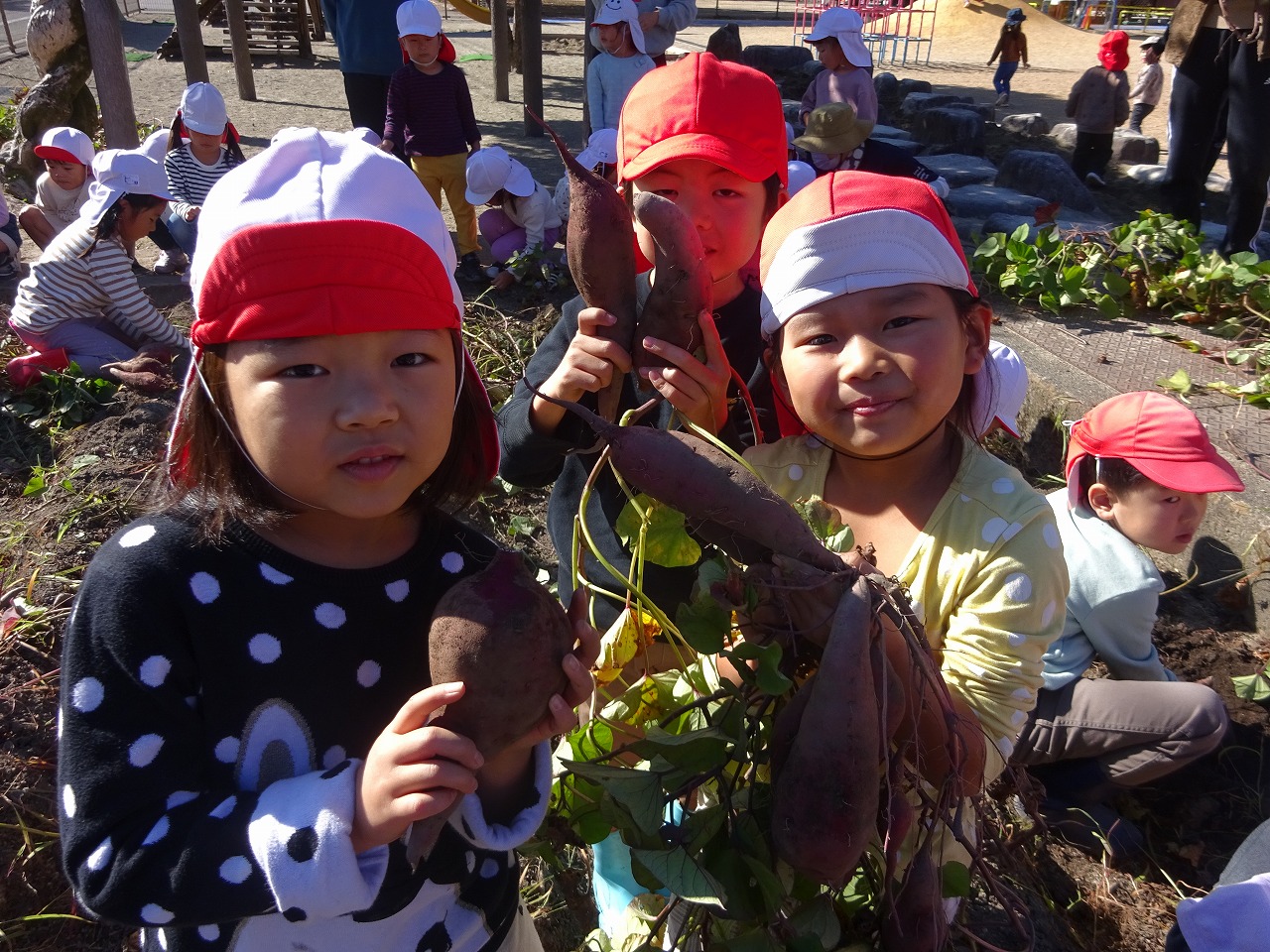 年長さんがサツマイモを掘りました。春に苗を植え、水やりをして育ててきました。今年の出来はどうかなと心配していましたが、思った以上に芋が採れ、焼き芋も心配なくできそうで良かったです。