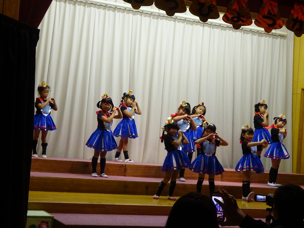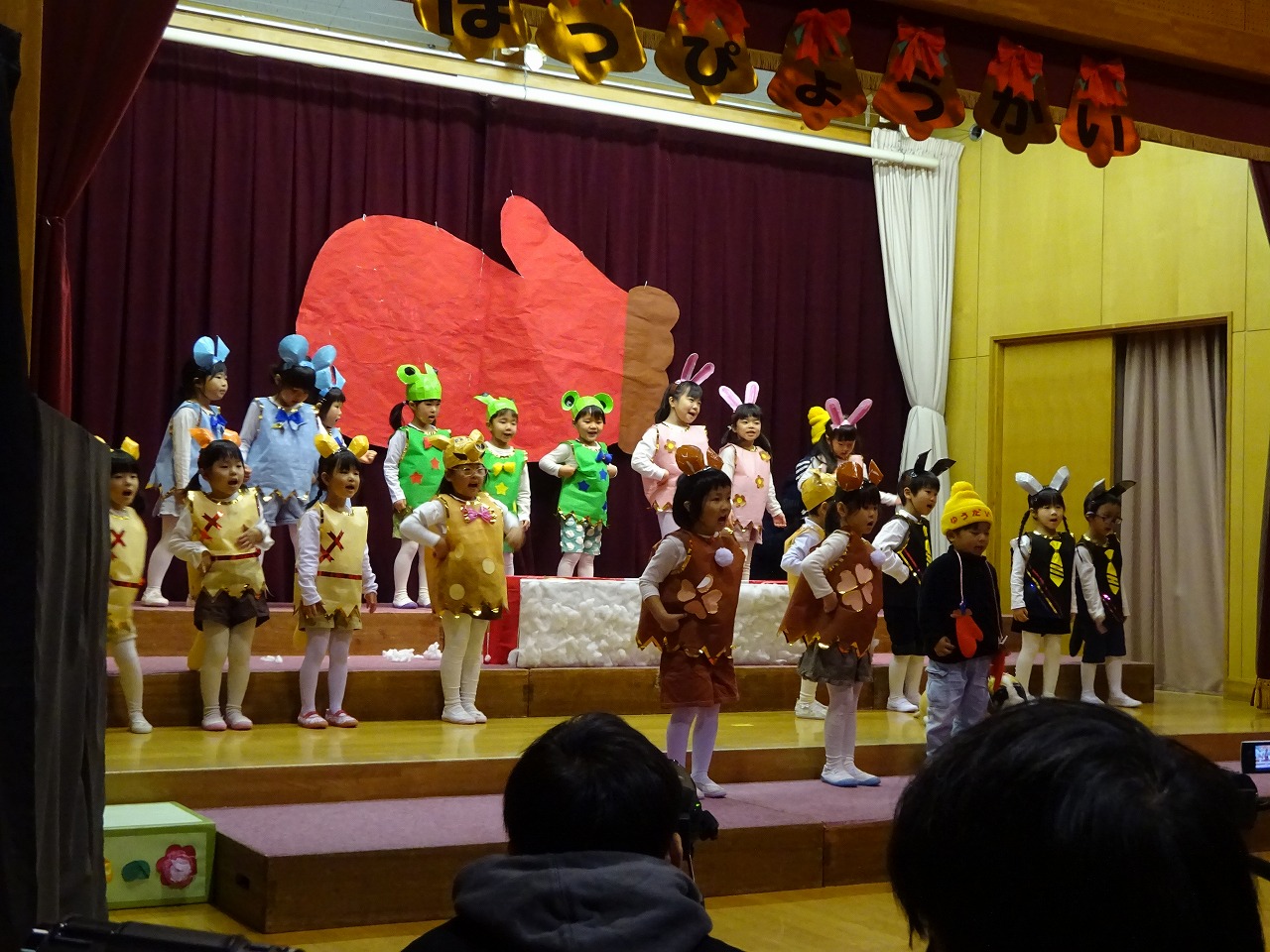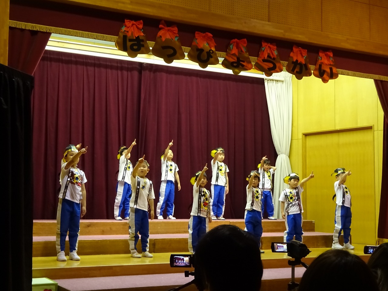 お家の方に観てもらうことを楽しみに練習してきました。始めは「緊張する〜」という声も聞かれましたが、ステージに立ってお家の方の顔を見ると安心したようで、客席に向かって笑顔で手を振る姿も見られました。お客様に温かい拍手をしていただき、たくさんの自信をつけた子どもたちです。み〜んなみ〜んな頑張りました!
