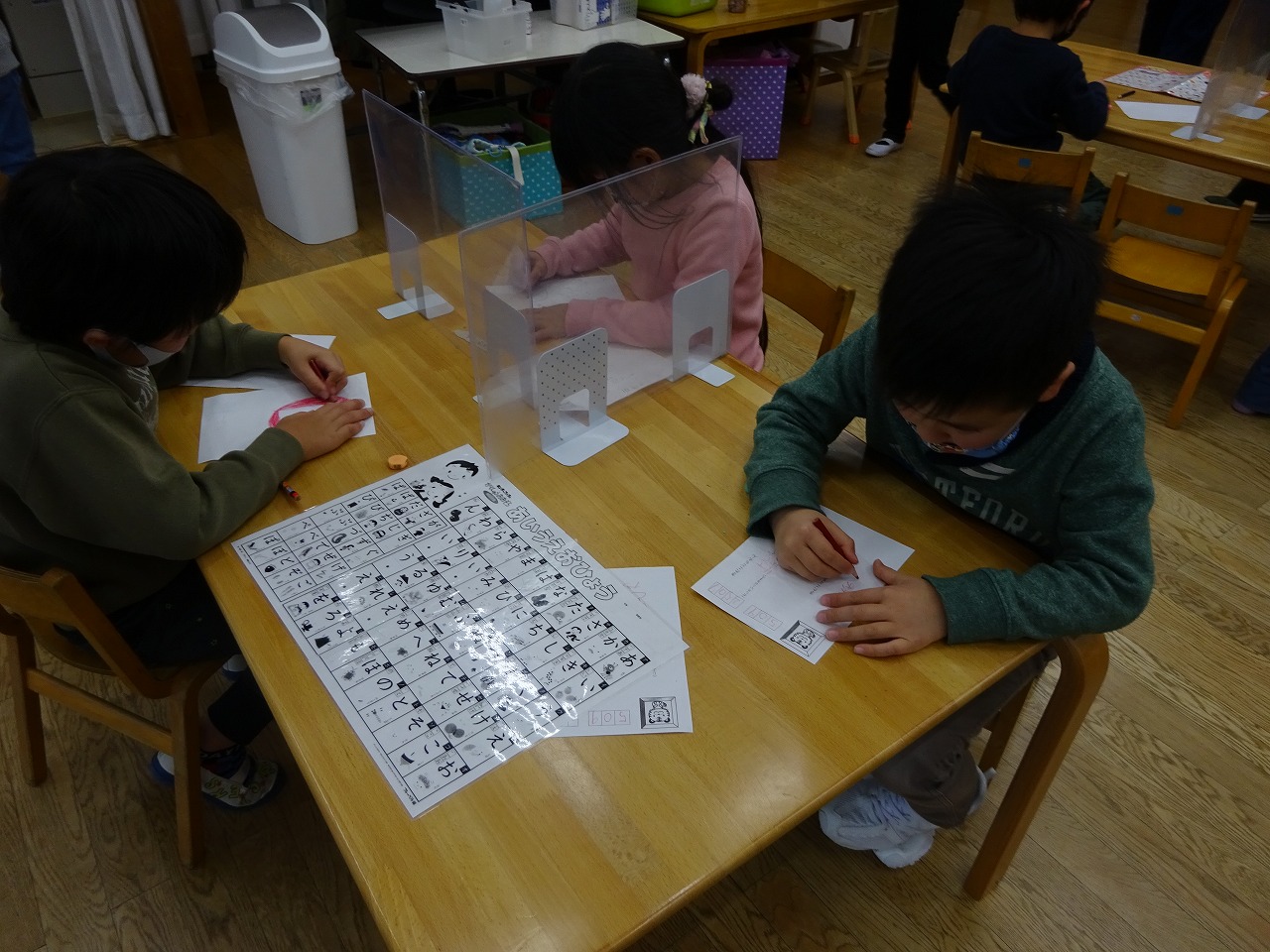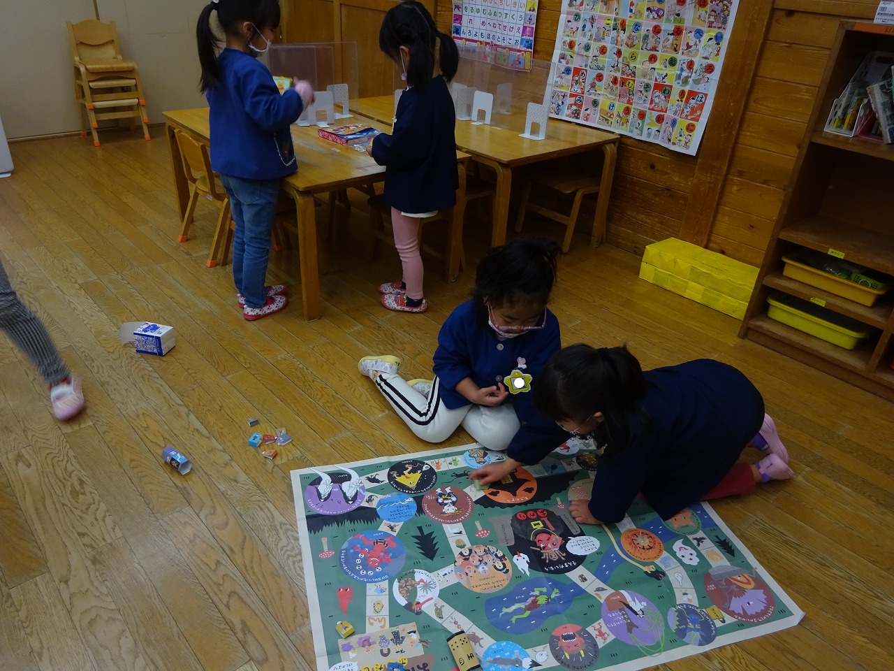 正月休み明けはどのクラスもこま回し、すごろく、かるた、福笑いなどお正月ならではの伝統的なあそびを楽しんでいます。また、年賀状をもらった経験から、園でも郵便ごっこが始まりました。年長さんがひらがな表を見ながら心を込めてはがきを書いていましたよ。