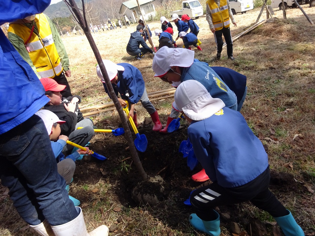 今年植えた木は、山桜2本と、しだれ桜1本です。掘った穴の中に苗木を入れ、みんなで「大きくなあれ」「きれいな花を咲かせてね」と声をかけながら土をかぶせました。みんなが中学生になる頃にはきれいな桜の花を咲かせてくれるかな。時々思い出して見に来てくれたら嬉しいです。