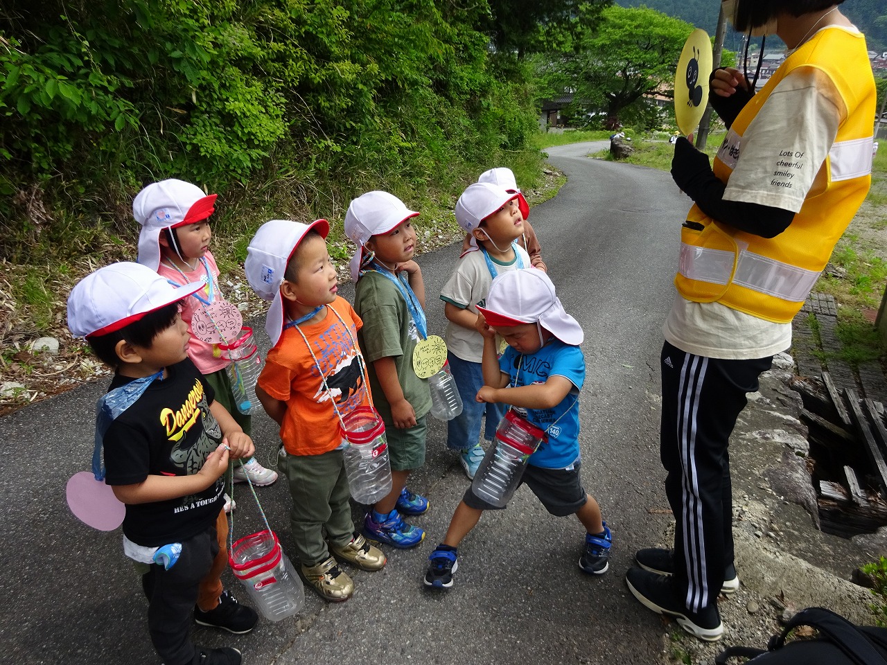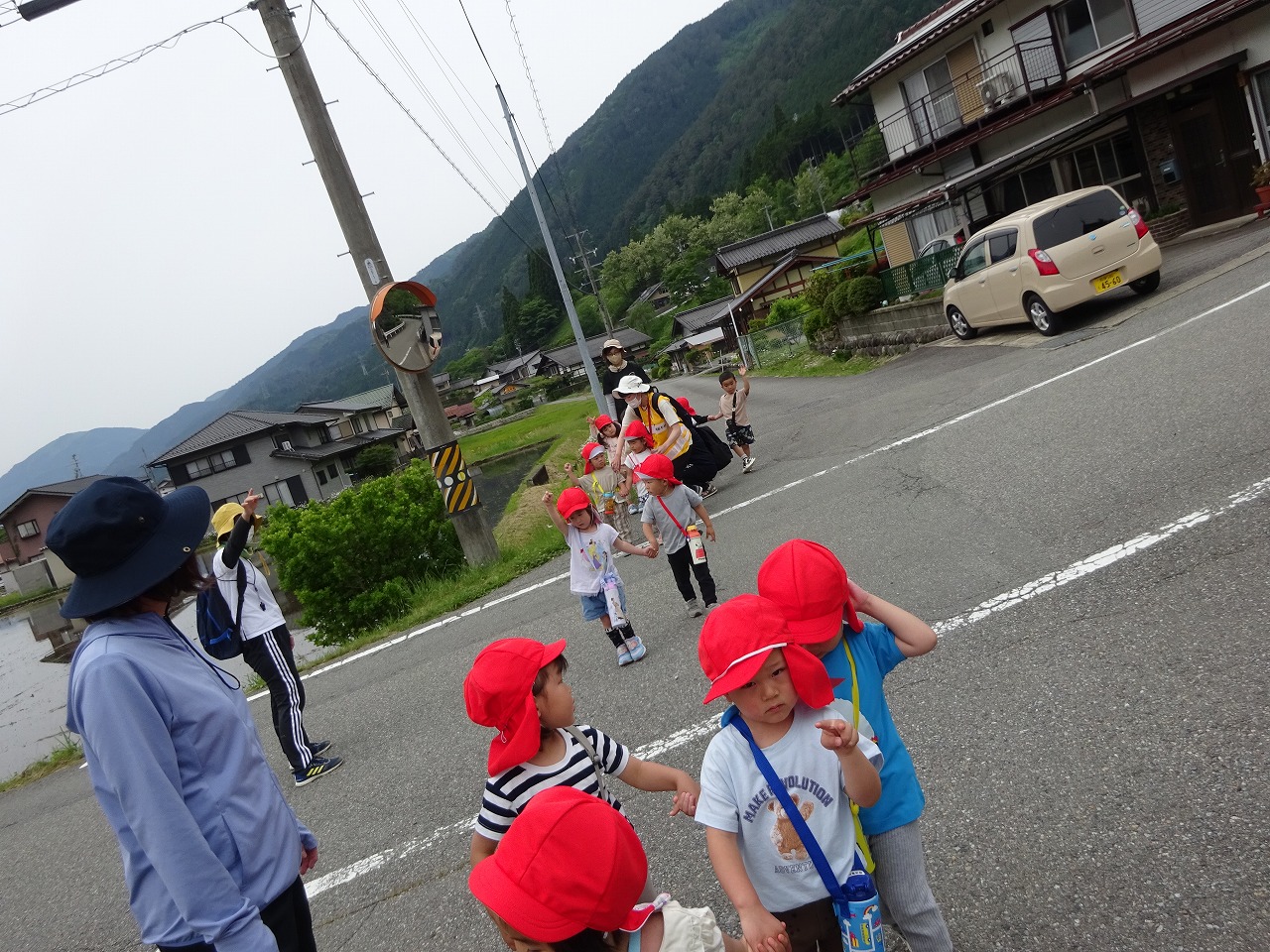 気持ちのいい春風をあび、年代ごとに野上地区を散策しながら未満児は園周辺、年少は北中学校、年中は野上公民館、年長は森のようちえん(高原の森)に遠足に出かけました。