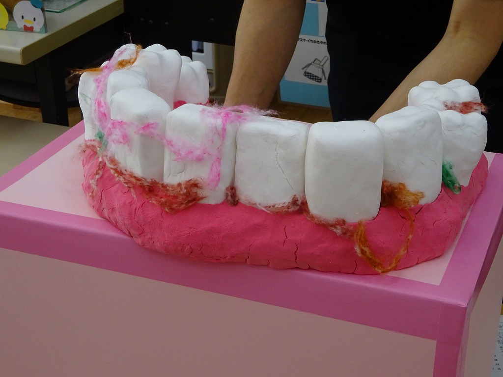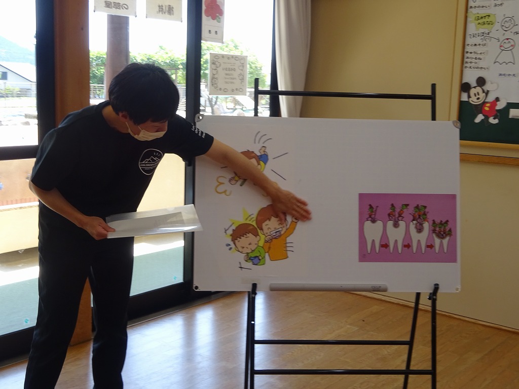 6月4日は虫歯予防デーです。また6月から年少さんも食後に歯磨きを始めます。その前に看護師より以上児全クラスに向け歯磨き指導を行いました。どうして虫歯になるのか、虫歯にならないためにはどうしたらいいのかをわかりやすくペープサートや大きな模型を使って話をしました。どのクラスも真剣に話を聞く姿勢がありました。又、年長さんはどこが虫歯になりやすいのかとの質問にも上手に答えることができましたよ。食後とても丁寧に歯磨きをしていた子ども達でした。